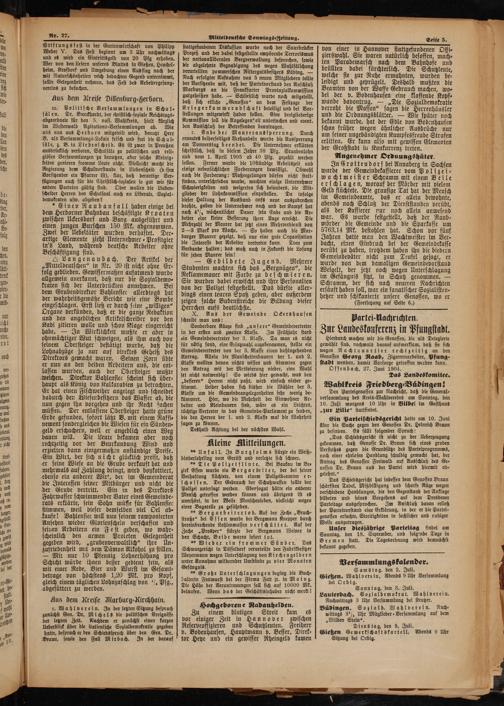 Versammlungskalender. Samstag. den 2. Juli. Gießen. Wahl verein, Abends 9 Uhr Versammlung bei Orbig. Sonntag, den 3. Juli. Lauterbach. Sozialdemokrat. Wahlverein. Nachmittags 3 Uhr Versammlung bei Keutzer. Büdingen. Sozilald. Wahlverein. Nach⸗ mittags 3½ Uhr Mitglieder⸗Versammlung auf dem „Wilden Stein“. Diens tag, den 5. Juli. Gießen Gewerkschaftskartell. Sitzung bei Orbig.