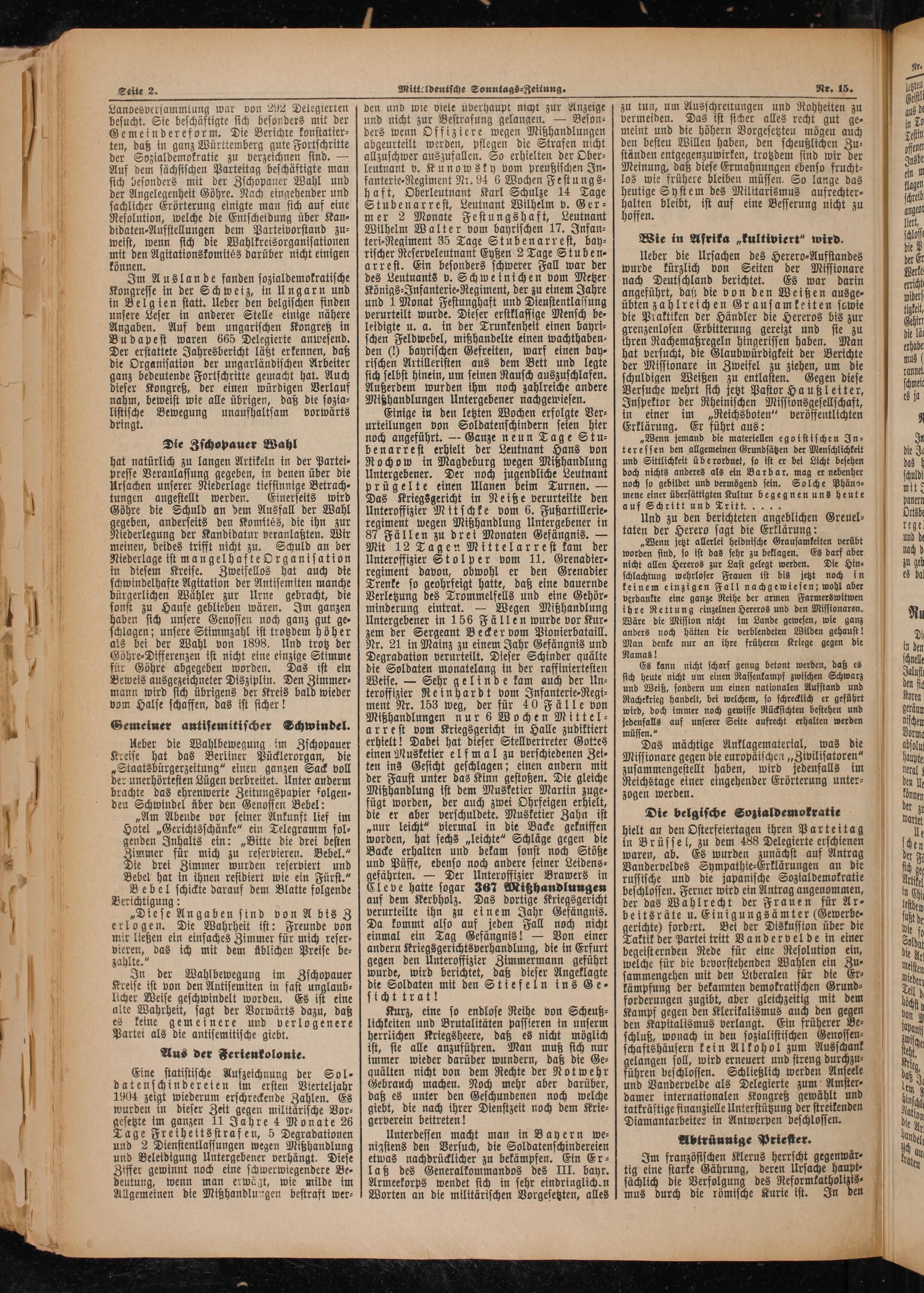 Kurz, eine so endlose Reihe von Scheuß⸗ lichkeiten und Brutalitäten passteren in unserm herrlichen Kriegsheere, daß es nicht möglich ist, ste alle anzuführen. Man muß sich nur immer wieder darüber wundern, daß die Ge⸗ quälten nicht von dem Rechte der Notwehr Gebrauch machen. Noch mehr aber darüber, daß es unter den Geschundenen noch welche giebt, die nach ihrer Dienstzeit noch dem Krie⸗ gerverein beitreten!