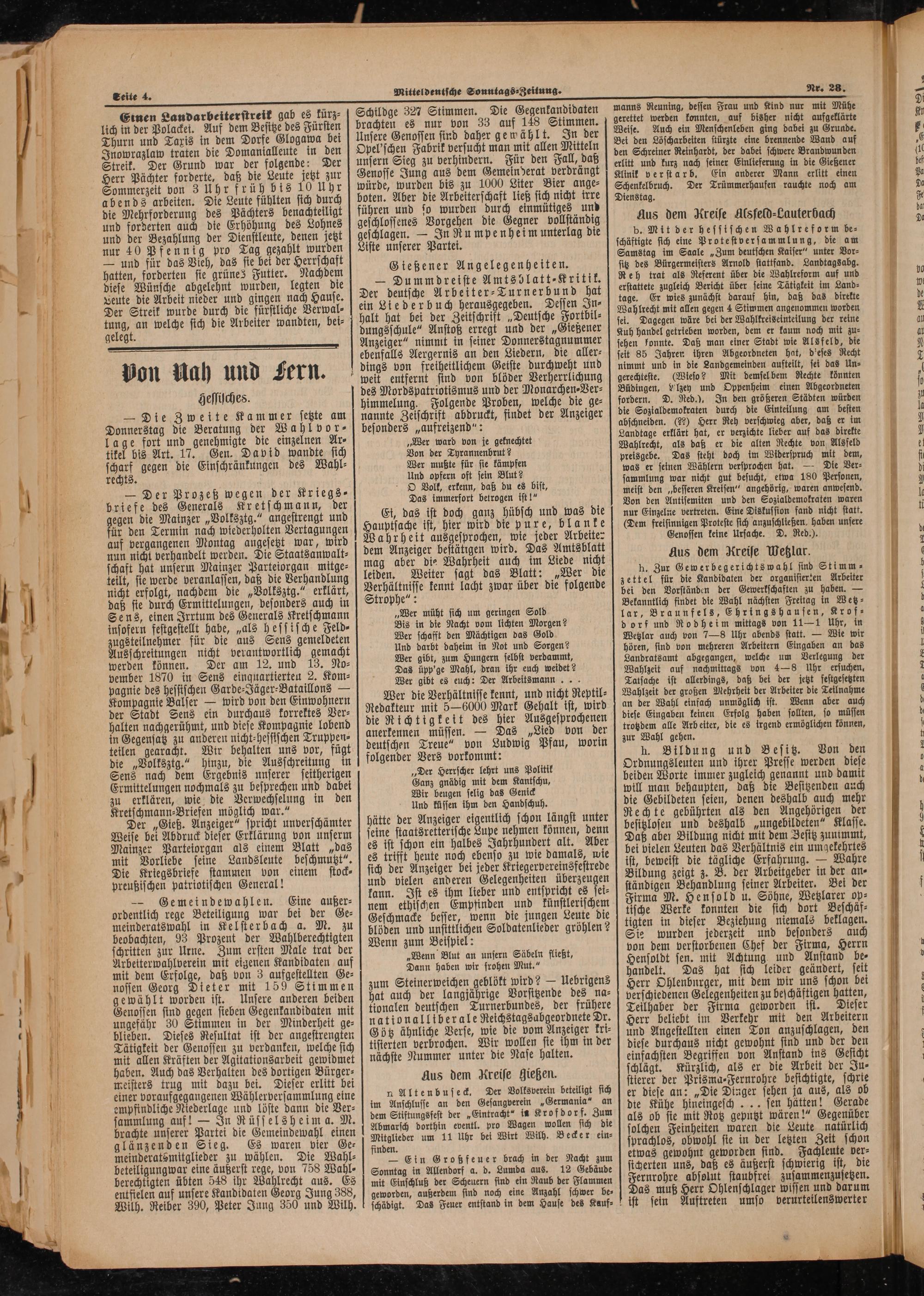 — Dummdreiste Amtsblatt⸗Kritik. Der deutsche Arbeiter⸗Turnerbund hat ein Liederbuch herausgegeben. Dessen In⸗ halt hat bei der Zeitschrift„Deutsche Fortbil⸗ dungsschule“ Anstoß erregt und der„Gießener Anzeiger“ nimmt in seiner Donnerstagnummer ebenfalls Aergernis an den Liedern, die aller⸗ dings von freiheitlichem Geiste durchweht und weit entfernt sind von blöder Verherrlichung des Mordspatriotismus und der Monarchen⸗Ver⸗ himmelung. Folgende Proben, welche die ge⸗ nannte Zeischrift abdruckt, findet der Anzeiger besonders„aufreizend“: