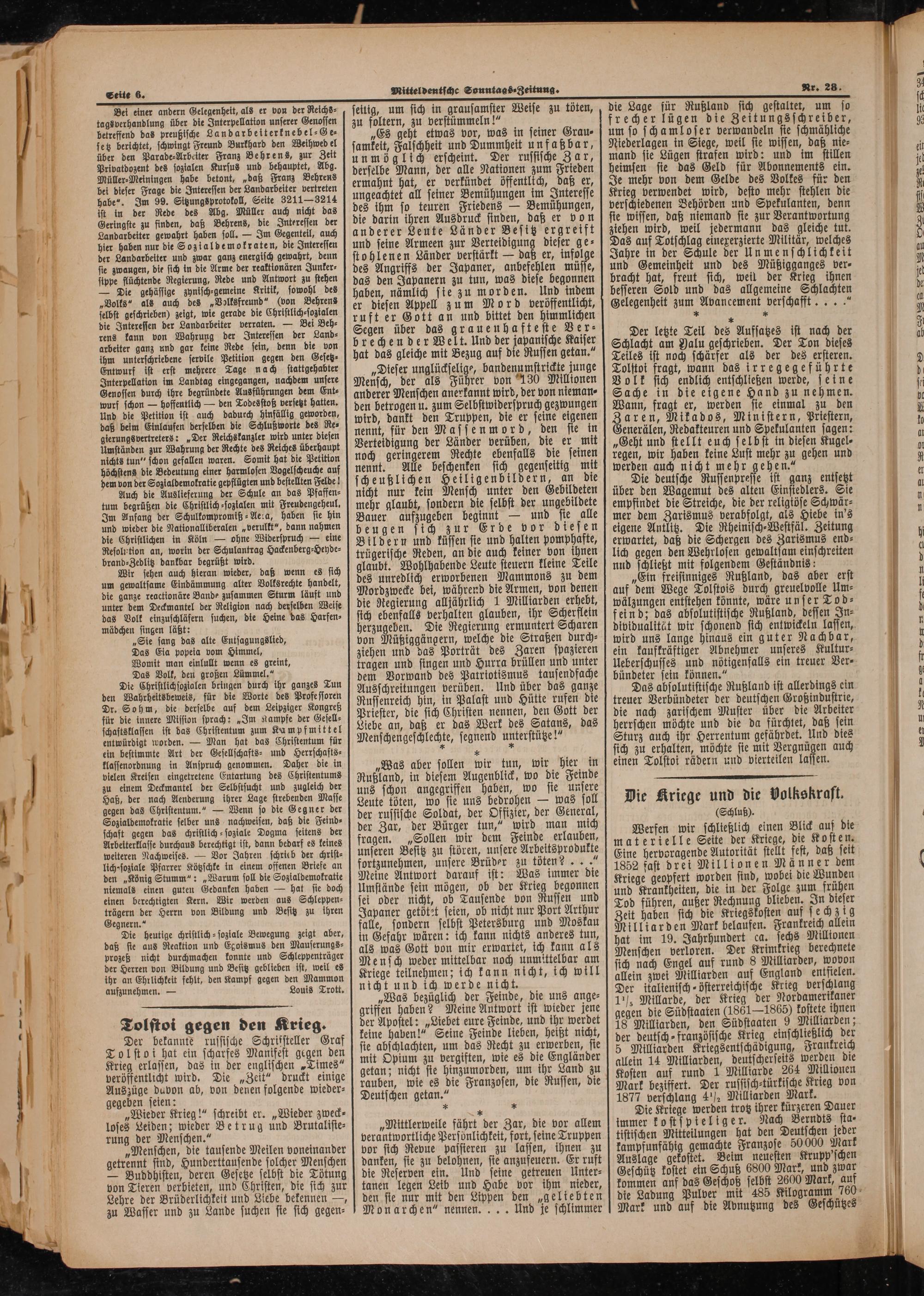 Schlacht am Yalu geschrieben. Der Ton dieses Teiles ist noch schärfer als der des ersteren. Tolstoi fragt, wann das irregegeführte Volk sich endlich entschließen werde, seine Sache in die eigene Hand zu nehmen. Wann, fragt er, werden sie einmal zu den Zaren, Mikados, Ministern, Priestern, Generälen, Redakteuren und Spekulanten sagen: „Geht und stellt euch selbst in diesen Kugel⸗ regen, wir haben keine Lust mehr zu gehen und werden auch nicht mehr gehen.“ „Die deutsche Russenpresse ist ganz entsetzt über den Wagemut des alten Einsiedlers. Sie empfindet die Streiche, die der religiöse Schwär⸗ mer dem Zarismus verabfolgt, als Hiebe in's eigene Antlitz. Die Rheinisch⸗Westfäl. Zeitung erwartet, daß die Schergen des Zarismus end⸗ lich gegen den Wehrlosen gewaltsam einschreiten nud schließt mit folgendem Geständnis: