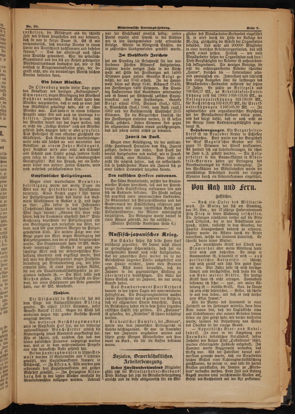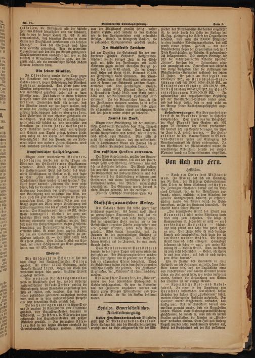 Die Stichwahl in Schwerin hat mit dem Siege des Nationalliberalen Büsing geendet. Er erhielt 13 213 Stimmen, unser Genosse Antrick 11213. Gegen die Wahl soll wiederum wegen sehr grober Verstöße Protest eingelegt werden..