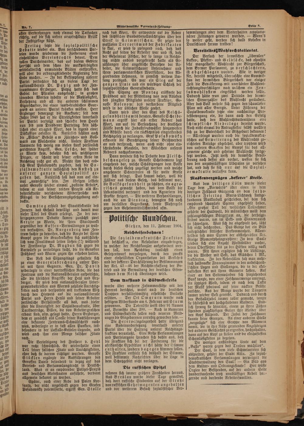Der Rest des Sitzungstags gestaltete sich zu einer Generalabrechnung unsrer Par⸗ tei mit ihren Gegnern. Gen. Dr. David widerlegte in einer vortrefflichen Rede, die das Zentrum und die Nationalliberalen aufpeitschte, alle die törichten Angriffe der Heyl und Erz⸗ berger. Er wies dem nationalliberalen Leder⸗ großindustriellen aus Worms zahllose Unrichtig⸗ keiten nach und verspottete mit treffendem Witz durch den Hinweis auf die nationalliberale Partei und Herrn Heyls und seiner Arbeiter persönliche Verhältnisse all das, was dieser über die Uneinigkeit der Sozialdemokratie, über Tarifverträge, Villen, die von Arbeitergroschen erbaut sind, usw. gesagt hatte. Herrn Erzberger, dem er zunächst als Quelle seiner Ausführungen eine bekannte Zentrums⸗Schmähschrift nach⸗ wies, widerlegte er in fast allen Punkten, ins⸗ besondere in der Lassalle⸗Ketteler⸗Legende, und 125 anch ihm eine Menge falscher Zitate nad*