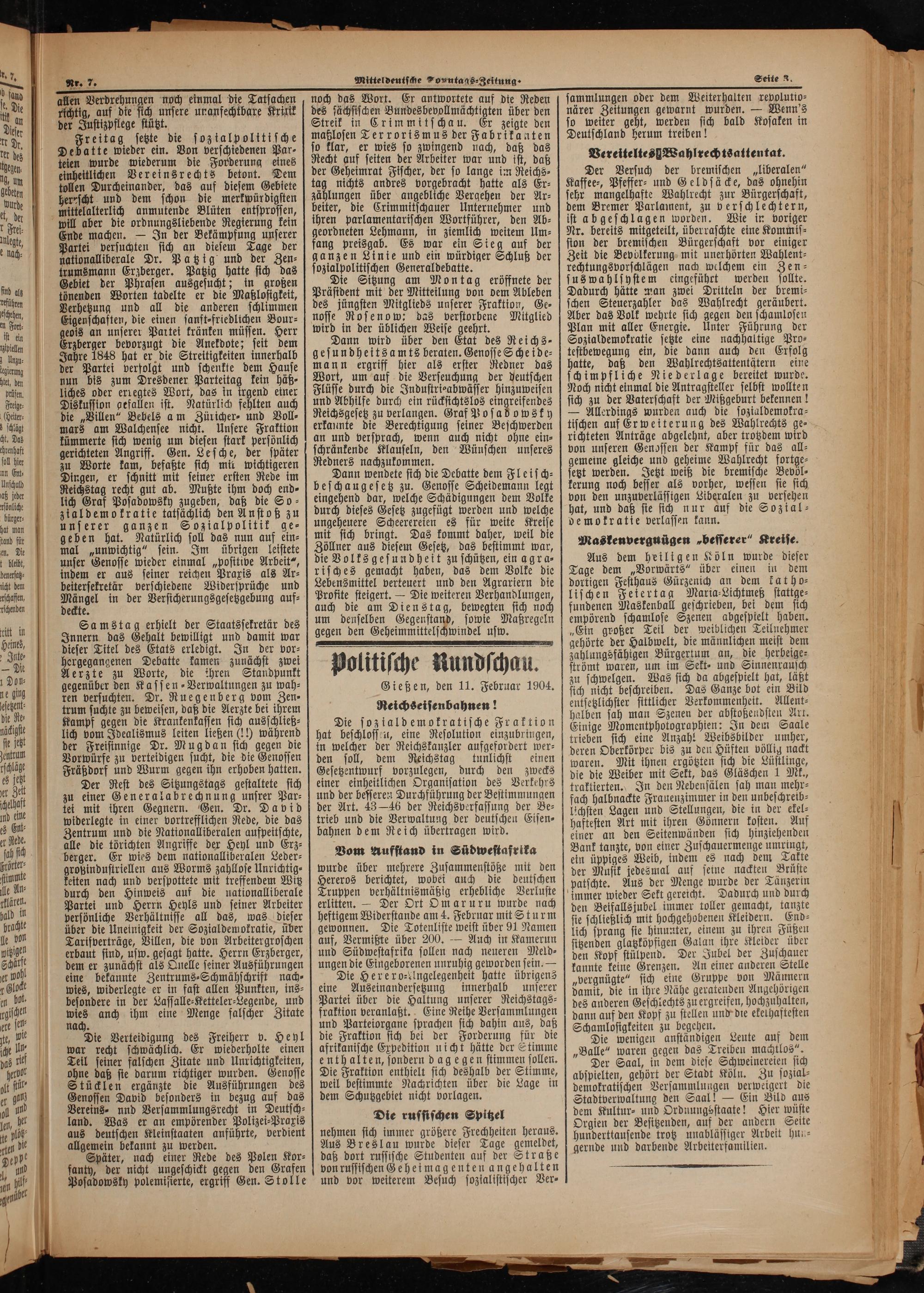 Aus dem heiligen Köln wurde dieser Tage dem„Vorwärts“ über einen in dem dortigen Festhaus Gürzenich an dem kat ho⸗ lischen Feiertag Maria⸗Lichtmeß stattge⸗ fundenen Maskenball geschrieben, bei dem sich empörend schamlose Szenen abgesptelt haben. „Ein großer Teil der weiblichen Teilnehmer gehörte der Halbwelt, die männlichen meist dem zahlungsfähigen Bürgertum an, die herbeige⸗ strömt waren, um im Sekt⸗ und Sinnenrausch zu schwelgen. Was sich da abgespielt hat, läßt sich nicht beschreiben. Das Ganze bot ein Bild entsetzlichster sittlicher Verkommenheit. Allent⸗ halben sah man Szenen der abstoßendsten Art. Einige Momentphotographien: In dem Saale trieben sich eine Anzahl Weibsbilder umher, deren Oberkörper bis zu den Hüften völlig nackt waren. Mit ihnen ergötzten sich die Lüstlinge, die die Weiber mit Sekt, das Gläschen 1 Mk., traktierten. In den Nebensälen sah man mehr⸗ fach halbnackte Frauenzimmer in den unbeschreib⸗ lichsten Lagen und Stellungen, die in der ekel⸗ haftesten Art mit ihren Gönnern kosten. Auf einer an den Seitenwänden sich hinziehenden Bank tanzte, von einer Zuschauermenge umringt, ein üppiges Weib, indem es nach dem Takte der Musik jedesmal auf seine nackten Brüste patschte. Aus der Menge wurde der Tänzerin immer wieder Sekt gereicht. Dadurch und durch den Beifallsjubel immer toller gemacht, tanzte sie schließlich mit hochgehobenen Kleidern. End⸗ lich sprang sie hinunter, einem zu ihren Füßen sitzenden glatzköpfigen Galan ihre Kleider über den Kopf stülpend. Der Jubel der Zuschauer kannte keine Grenzen. An einer anderen Stelle „vergnügte“ sich eine Gruppe von Männern damit, die in ihre Nähe geratenden Angehörigen des anderen Geschlechts zu ergreifen, hochzuhalten, dann auf den Kopf zu stellen und die ekelhaftesten Schamlosigkeiten zu begehen. f