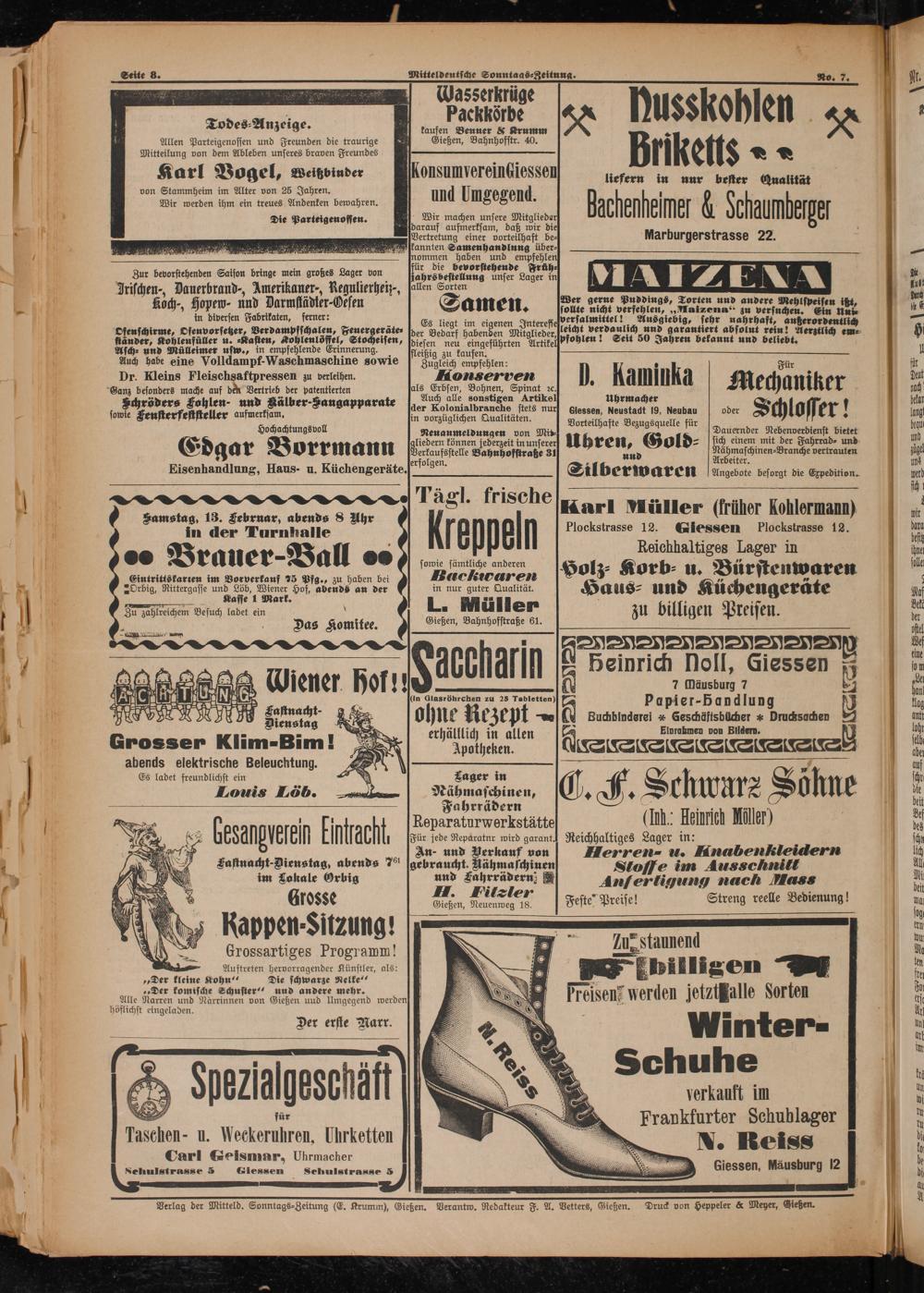 Verlag der Mitteld. Sonntags⸗Zeitung(E. Krumm), Gießen. Verantw. Redakteur F. A. Vetters, Gießen.