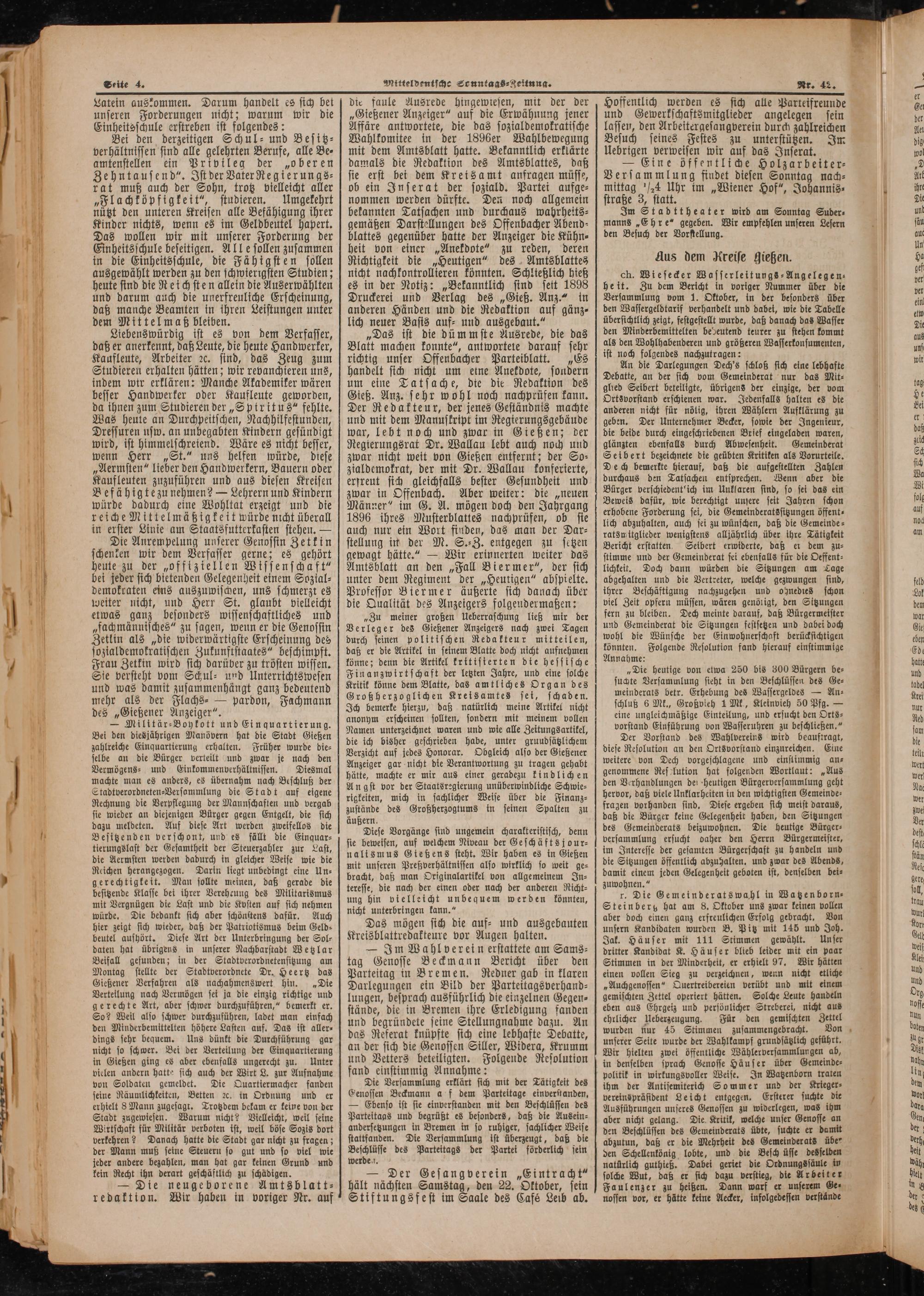 ch. Wiesecker Wasserleitungs-Angelegen⸗ heit. Zu dem Bericht in voriger Nummer über die Versammlung vom 1. Oktober, in der besonders über den Wassergeldtarif verhandelt und dabet, wie die Tabelle übersichtlich zeigt, festgestellt wurde, daß danach das Wasser den Minderbemittelten bedeutend teurer zu stehen kommt als den Wohlhabenderen und größeren Wasserkonsumenten, ist noch folgendes nachzutragen: