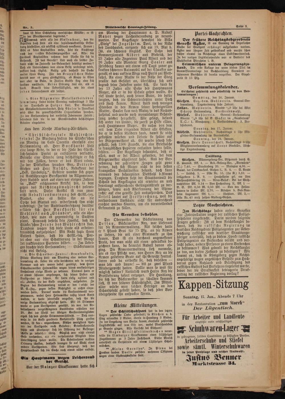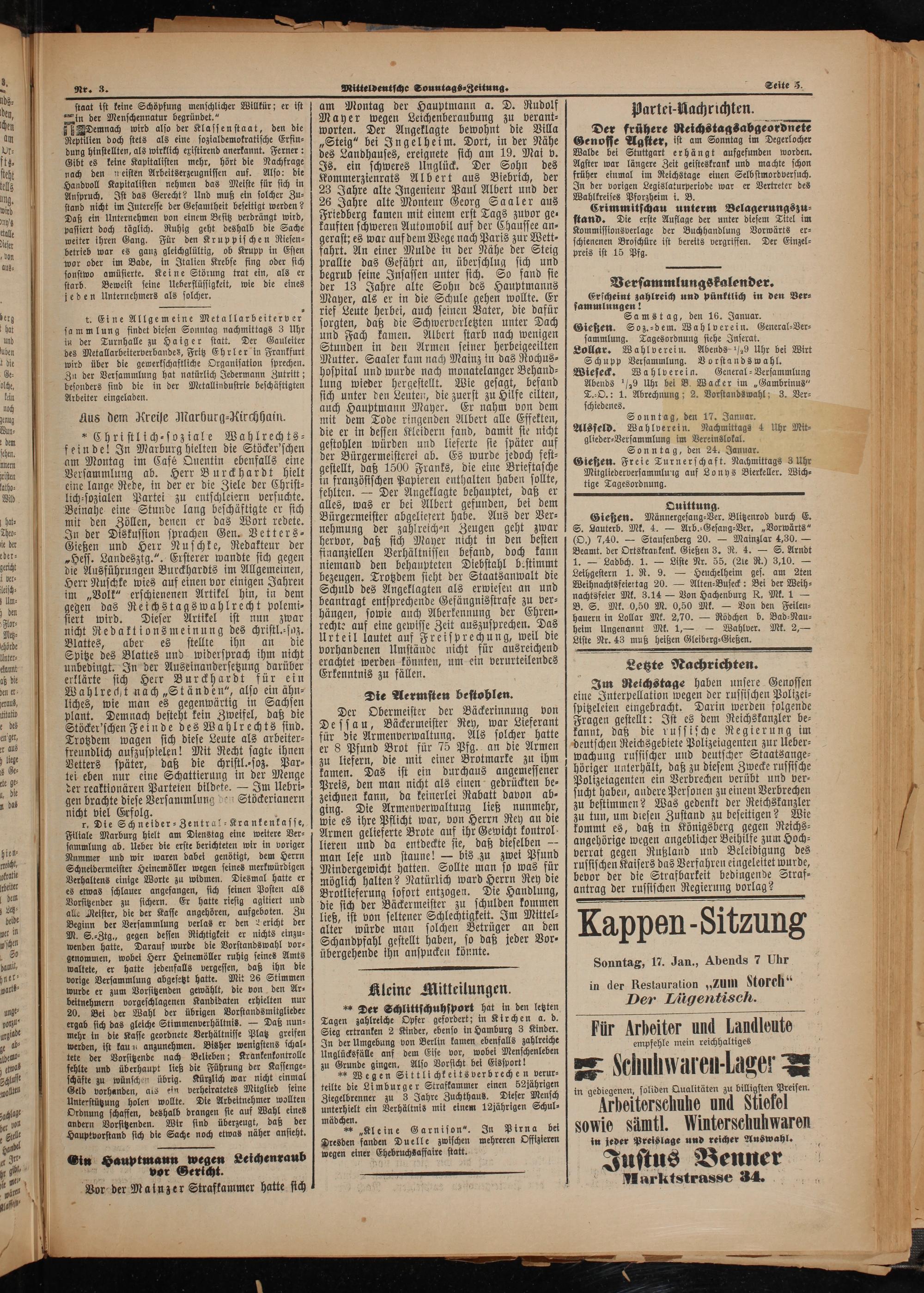 Versammlungskalender. Erscheint zahlreich und pünktlich in den Ver⸗ sammlungen! Samstag, den 16. Januar. Gießen. Soz.⸗dem. Wahlverein. General⸗Ver⸗ sammlung. Tagesordnung siehe Inserat. Lollar. Wahlverein. Abends 7/9 Uhr bei Wirt Schupp Versammlung. Vorstandswahl. Wieseck. Wahlverein. General⸗Versammlung Abends ½9 Uhr bei B. Wacker im„Gambrinus“ T.⸗O.: 1. Abrechnung; 2. Vorstandswahl; 3. Ver⸗ schiedenes. 5 Sonntag, den 17. Januar. Alsfeld. Wahlverein. Nachmittags 4 Uhr Mit⸗ glieder⸗Versammlung im Vereinslokal. Sonntag, den 24. Januar. Gießen. Freie Turnerschaft. Nachmittags 3 Uhr Mitgliederversammlu'ig auf Lonys Bierkeller. Wich⸗ tige Tagesordnung.