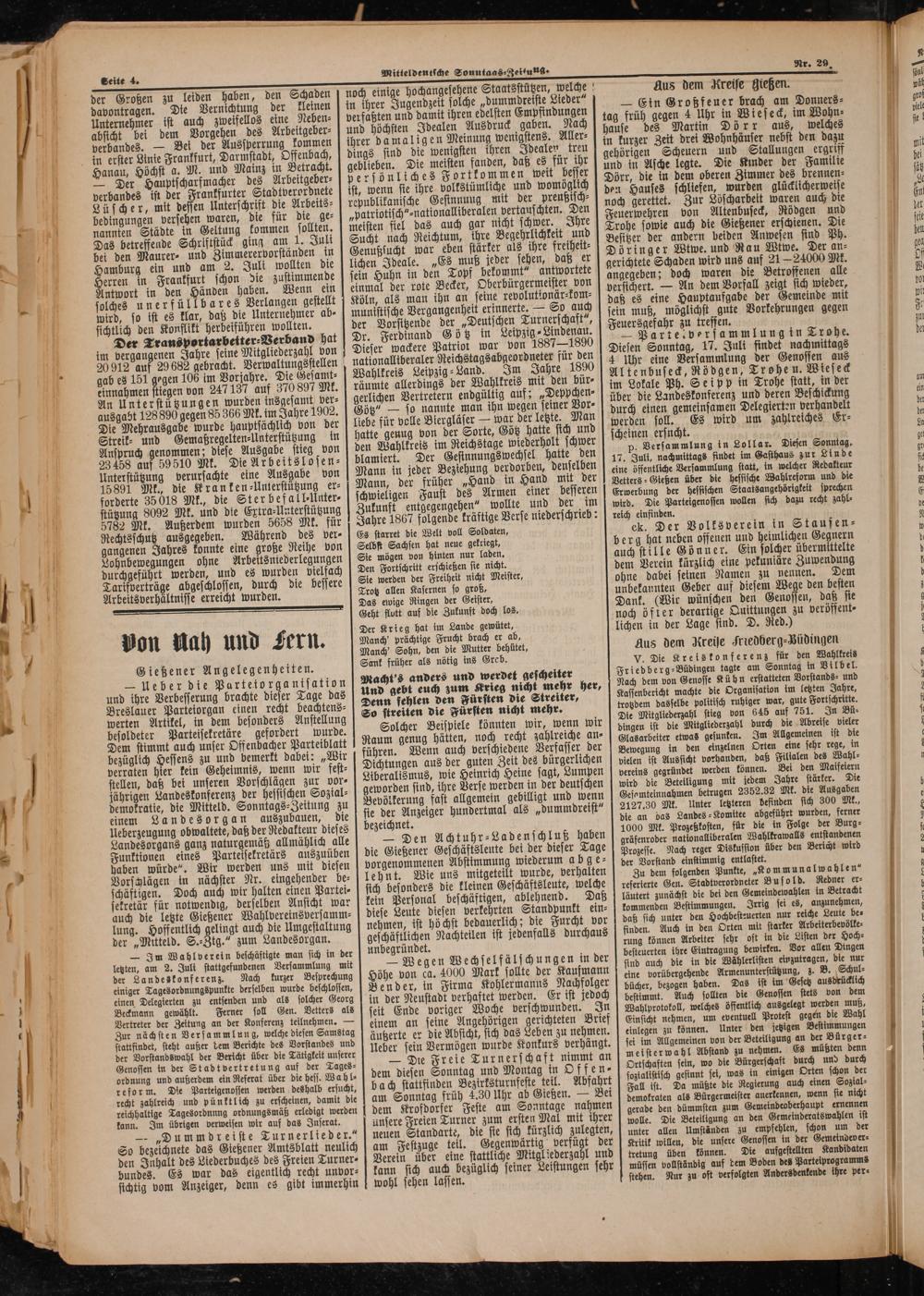 — Im Wahlverein beschäftigte man sich in der letzten, am 2. Juli stattgefundenen Versammlung mit der Landeskonferenz. Nach kurzer Besprechung einiger Tagesordnungspunkte derselben wurde beschlossen, einen Delegierten zu entsenden und als solcher Georg Beckmann gewählt. Ferner soll Gen. Vetters als Vertreter der Zeitung an der Konferenz teilnehmen.— Zur nächsten Versammlung, welche diesen Samstag stattfindet, steht außer dem Berichte des Vorstandes und der Vorstandswahl der Bericht über die Tätigkeit unserer Genossen in der Stadtvertretung auf der Tages⸗ ordnung und außerdem ein Referat über die hess. Wahl⸗ reform. Die Parteigenossen werden deshalb ersucht, recht zahlreich und pünktlich zu erscheinen, damit die reichhaltige Tagesordnung ordnungsmäß erledigt werden kann. Im übrigen verweisen wir auf das Inserat.