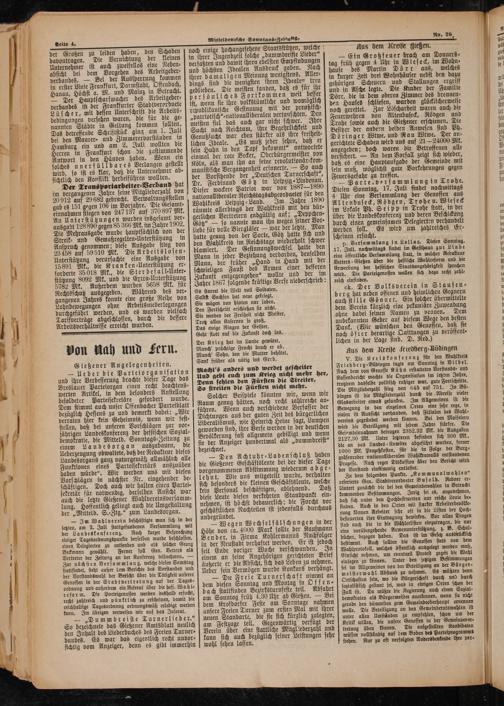 — Ein Großfeuer brach am Donners⸗ tag früh gegen 4 Uhr in Wieseck, im Wohn⸗ hause des Martin Dörr aus, welches in kurzer Zeit drei Wohnhäuser nebst den dazu gehörigen Scheuern und Stallungen ergriff und in Asche legte. Die Kinder der Familie Dörr, die in dem oberen Zimmer des brennen⸗ den Hauses schliefen, wurden glücklicherweise noch gerettet. Zur Löscharbeit waren auch die Feuerwehren von Altenbuseck, Rödgen und Trohe sowie auch die Gießener erschienen. Die Besitzer der andern beiden Anwesen sind Ph. Döringer Wtwe. und Rau Wtwe. Der an⸗ gerichtete Schaden wird uns auf 21 24000 Mk. angegeben; doch waren die Betroffenen alle versichert.— An dem Vorfall zeigt sich wieder, daß es eine Hauptaufgabe der Gemeinde mit sein muß, möglichst gute Vorkehrungen gegen Feuersgefahr zu treffen.