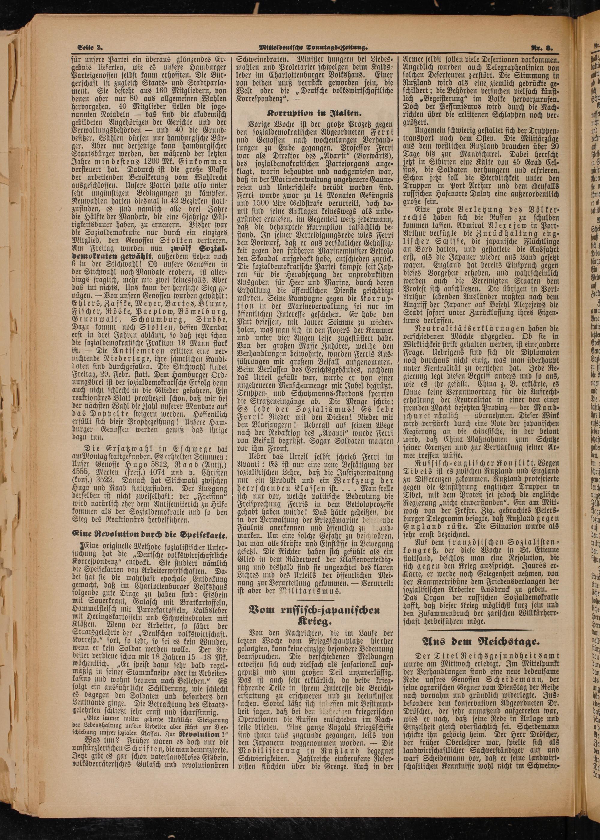 Vorige Woche ist der große Prozeß gegen den sozialdemokratischen Abgeordneten Ferri und Genossen nach wochenlangen Verhand- lungen zu Ende gegangen. Professor Ferri war als Direktor des„Avanti“(Vorwärts), des sozialdemokratischen Parteiorgans ange⸗ klagt, worin behauptet und nachgewiesen war, daß in der Marineverwaltung ungeheuere Gaune⸗ reien und Unterschleife verübt worden sind. Ferri wurde zwar zu 14 Monaten Gefängnis und 1500 Lire Geldstrafe verurteilt, doch da⸗ mit sind seine Anklagen keineswegs als unbe⸗ gründet erwiesen, im Gegenteil weiß jedermann, daß die behauptete Korruption tatsächlich be⸗ stand. In seiner Verteidigungsrede wies Ferri den Vorwurf, daß er aus persönlicher Gehässig⸗ keit gegen den früheren Marineminister Bettolo den Skandal aufgedeckt habe, entschieden zurück. Die sozialdemokratische Partei kämpfe seit Jah⸗ ren für die Herabsetzung der unproduktiven Ausgaben für Heer und Marine, durch deren Erhaltung die öffentlichen Dienste geschädigt würden. Seine Kampagne gegen die Korrup⸗ tion in der Marxineverwaltung sei nur im öffentlichen Interesse geschehen. Er habe den Mut besessen, mit lauter Stimme zu wieder⸗ holen, was man sich in den Foyers der Kammer und unter vier Augen leise zugeflüstert habe. Von der großen Masse Zuhörer, welche den Verhandlungen beiwohnte, wurden Ferris Aus⸗ führungen mit großem Beifall aufgenommen. Beim Verlassen des Gerichtsgebäudes, nachdem das Urteil gefällt war, wurde er von einer ungeheueren Menschenmenge mit Jubel begrüßt. Truppen⸗ und Schutzmanns⸗Kordons sperrten die Straßeneingänge ab. Die Menge schrie: Es lebe der Sozialismus! Es lebe Ferri! Nieder mit den Dieben! Nieder mit den Blutsaugern! Ueberall auf seinem Wege nach der Redaktion des„Avanti“ wurde Ferri von Beifall begrüßt. Sogar Soldaten machten vor ihm Front.