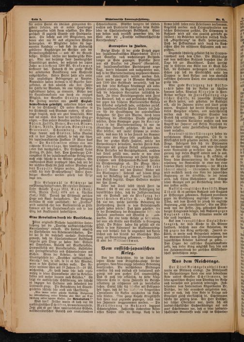 Von den Nachrichten, die im Laufe der letzten Woche vom Kriegsschauplatze hierher gelangten, kann keine einzige besondere Bedeutung beanspruchen. Die 5 Meldungen erweisen sich auch vielfach als sensationell auf⸗ geputzt und zum großen Teil unzuverlässig. Das ist auch sehr erklärlich, da beide krieg⸗ führende Teile in ihrem Interesse die Bericht⸗ erstattung zu erschweren und zu beeinflussen suchen. Soviel läßt sich ind essen mit Bestimmt⸗ heit sagen, daß bei den bsc zen kriegerischen Operationen die Russen entschieden im Nach⸗ teile blieben. Fine ganze Anzahl Kriegsschiffe sind ihnen teils zugrunde gegangen, teils von den Japanern weggenommen worden.— Die Mobilisierung in Rußland de Schwierigkeiten. Zahlreiche einberufene Reser⸗