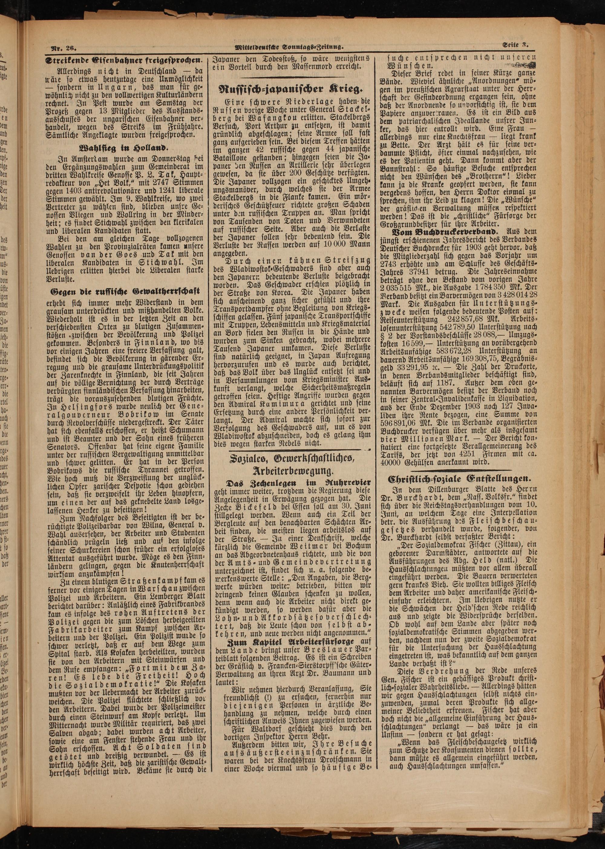 Durch einen kühnen Streifzu des Wladiwostok⸗Geschwaders sind aber 0 den Japanern bedeutende Verluste beigebracht worden. Das Geschwader erschien plötzlich in der Straße von Korea. Die Japaner haben sich anscheinend ganz sicher gefühlt und ihre Transportdampfer ohne Begleitung von Kriegs⸗ schiffen gelassen. Fünf japanische Transportschiffe mit Truppen, Lebensmitteln und Kriegs material an Bord fielen den Russen in die Hände und wurden zum Sinken gebracht, wobei mehrere Tausend Japaner umkamen. Diese Verluste sind natürlich geeignet, in Japan Aufregung hervorzurufen und es wurde auch berichtet, daß das Volk über das Unglück entsetzt sei und in Versammlungen vom Kriegsminister Aus⸗ kunft verlangt, welche Sicherheitsmaßregeln getroffen seien. Heftige Angriffe wurden gegen den Admiral Kumimura gerichtet und seine Ersetzung durch eine andere Persönlichkeit ver⸗ langt. Der Admiral machte sich sofort zur Verfolgung des Geschwaders auf, um es von Wladiwostok abzuschneiden, doch es gelang ihm dies wegen starken Nebels nicht.
