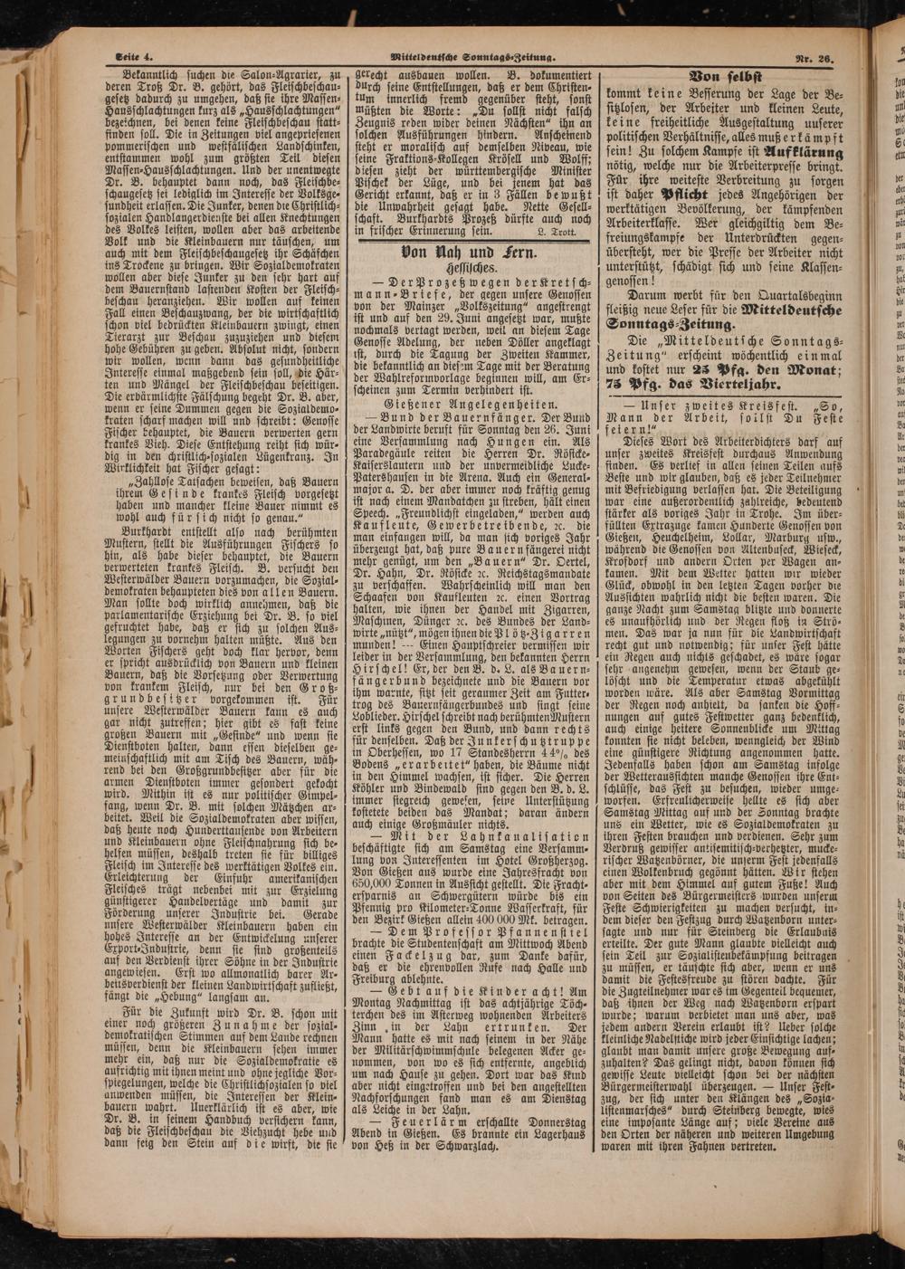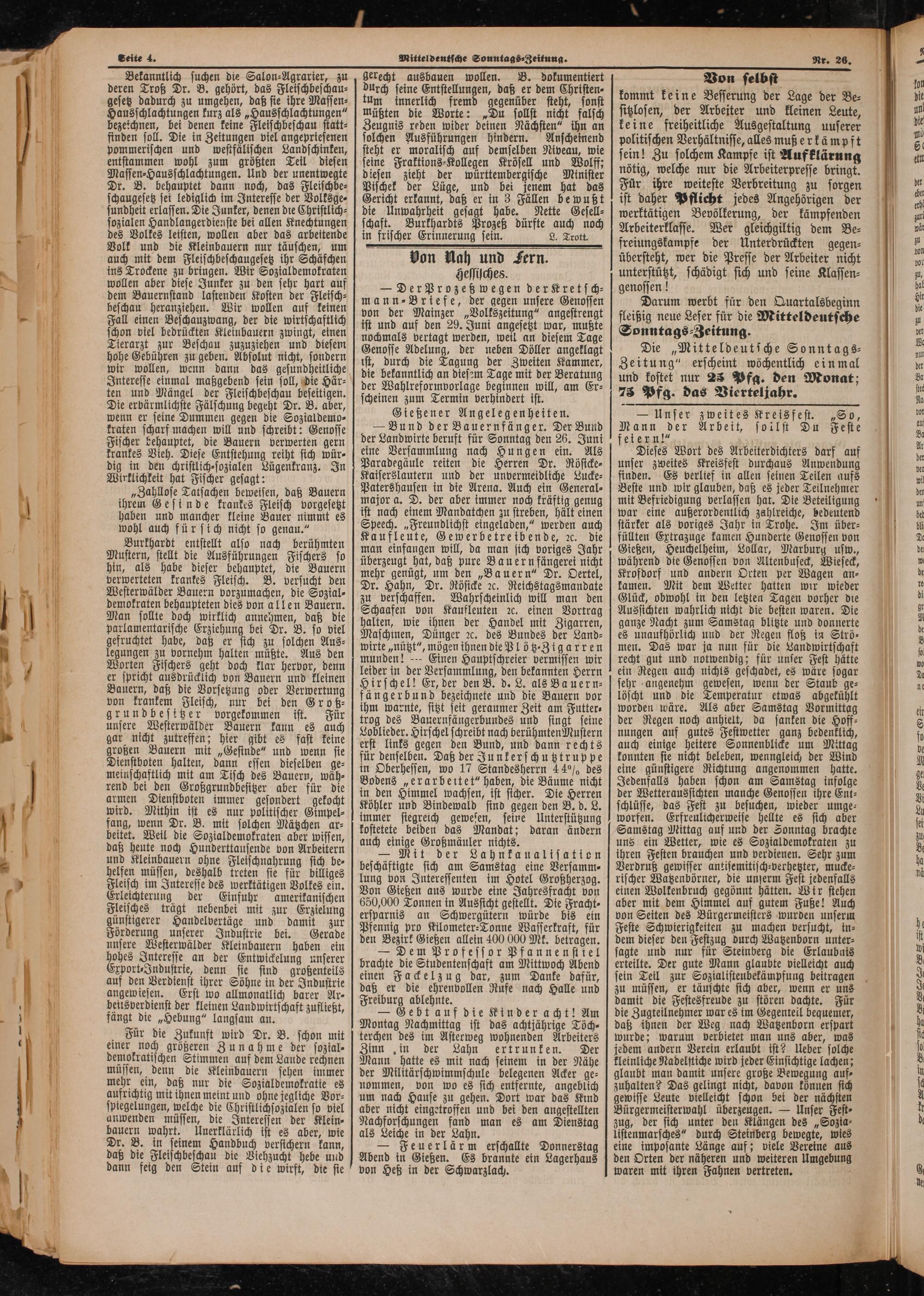 — Bund der Bauernfänger. Der Bund der Landwirte beruft für Sonntag den 26. Juni eine Versammlung nach Hungen ein. Als Paradegäule reiten die Herren Dr. Röstcke⸗ Kaiserslautern und der unvermeidliche Lucke⸗ Patershausen in die Arena. Auch ein General⸗ major a. D. der aber immer noch kräftig genug ist nach einem Mandatchen zu streben, hält einen Speech.„Freundlichst eingeladen,“ werden auch Kaufleute, Gewerbetreibende, ꝛc. die man einfangen will, da man sich voriges Jahr überzeugt hat, daß pure Bauern fängerei nicht mehr genügt, um den„Bauern“ Dr. Oertel, Dr. Hahn, Dr. Rösicke ꝛc. Reichstagsmandate zu verschaffen. Wahrscheinlich will man den Schaafen von Kaufleuten ꝛc. einen Vortrag halten, wie ihnen der Handel mit Zigarren, Maschinen, Dünger ꝛc. des Bundes der Land⸗ wirte„nützt“, mögen ihnen die Plötz⸗Zigarren munden!— Einen Hauptschreier vermissen wir leider in der Versammlung, den bekannten Herrn Hirschel! Er, der den B. d. L. als Bauern⸗ fängerbund bezeichnete und die Bauern vor ihm warnte, sitzt seit geraumer Zeit am Futter⸗ trog des Bauernfängerbundes und singt seine Loblieder. Hirschel schreibt nach berühmten Mustern erst links gegen den Bund, und dann rechts für denselben. Daß der Junkerschutztruppe in Oberhessen, wo 17 Standesherrn 44% des Bodens„erarbeitet“ haben, die Bäume nicht in den Himmel wachsen, ist sicher. Die Herren Köhler und Bindewald sind gegen den B. d. L. immer siegreich gewesen, seine Unterstützung kostetete beiden das Mandat; daran ändern auch einige Großmäuler nichts.