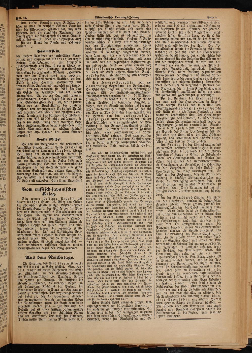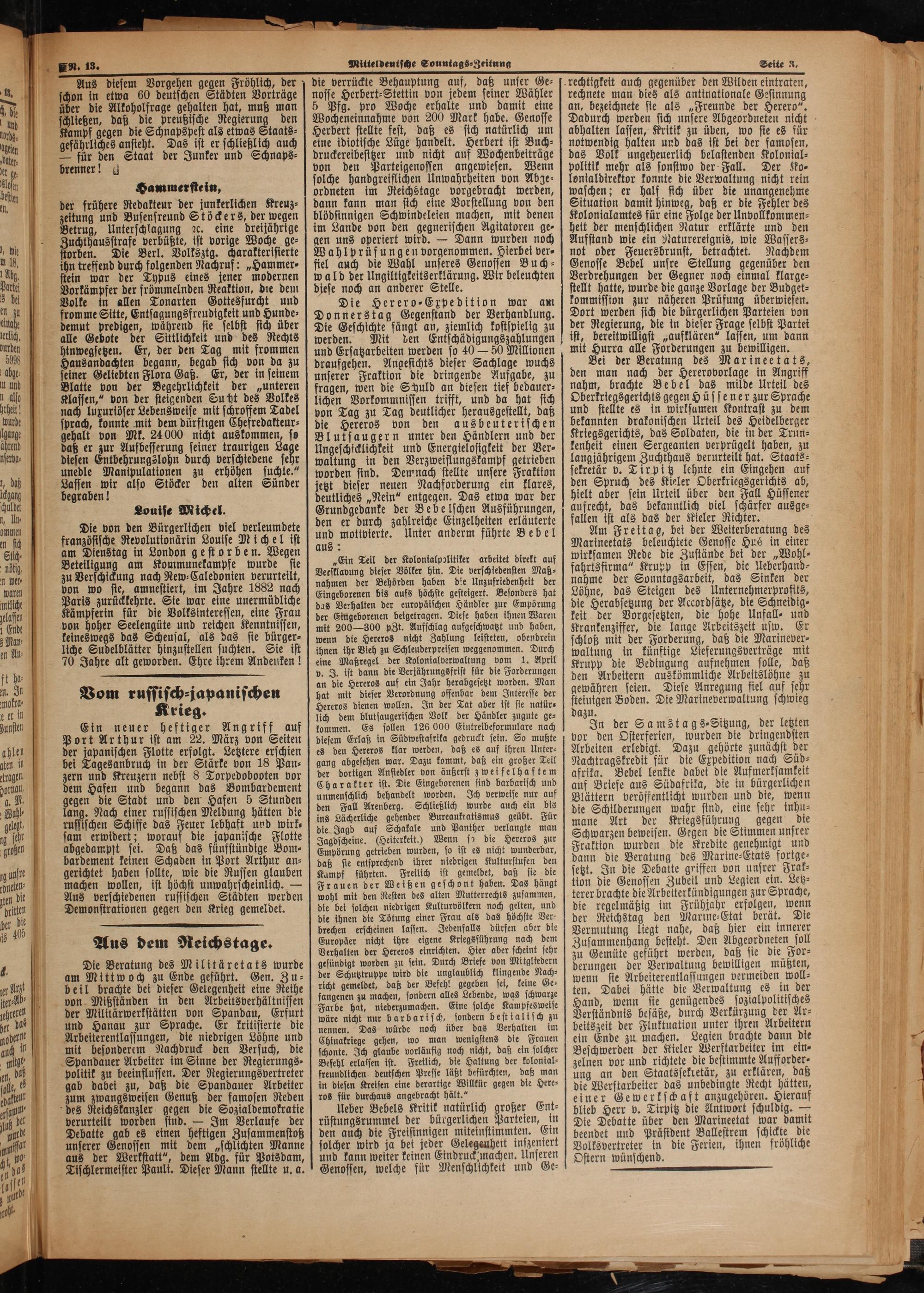 In der Samstags ⸗-⸗Sitzung, der letzten vor den Osterferien, wurden die dringendsten Arbeiten erledigt. Dazu gehörte zunächst der Nachtragskredit für die Expedition nach Süd⸗ afrika. Bebel lenkte dabet die Aufmerksamkeit auf Briefe aus Südafrika, die in bürgerlichen Blättern veröffentlicht wurden und die, wenn die Schilderungen wahr sind, eine sehr inhu⸗ mane Art der Kriegsführung gegen die Schwarzen beweisen. Gegen die Stimmen unsrer Fraktion wurden die Kredite genehmigt und dann die Beratung des Marine-Etats fortge⸗ setzt. In die Debatte griffen von unsrer Frak⸗ tion die Genossen Zubeil und Legien ein. Letz⸗ terer brachte die Arbeiterkündigungen zur Sprache, die regelmäßig im Frühjahr erfolgen, wenn der Reichstag den Marine⸗Etat berät. Die Vermutung liegt nahe, daß hier ein innerer Zusammenhang besteht. Den Abgeordneten soll zu Gemüte geführt werden, daß sie die For⸗ derungen der Verwaltung bewilligen müßten, wenn sie Arbeiterentlassungen vermeiden woll⸗ ten. Dabei hätte die Verwaltung es in der Hand, wenn sie genügendes sozialpolitisches Verständnis besäße, durch Verkürzung der Ar⸗ beitszeit der Fluktuation unter ihren Arbeitern ein Ende zu machen. Legien brachte dann die Beschwerden der Kieler Werftarbeiter im ein⸗ zelnen vor und richtete die bestimmte Aufforder⸗ ung an den Staatssekretär, zu erklären, daß die Werftarbeiter das unbedingte Recht hätten, einer Gewerkschaft anzugehören. Hierauf blieb Herr v. Tirpitz die Antwort schuldig.— Die Debatte über den Marineetat war damit beendet und Präsident Ballestrem schickte die Volksvertreter in die Ferien, ihnen fröhliche Ostern wünschend.