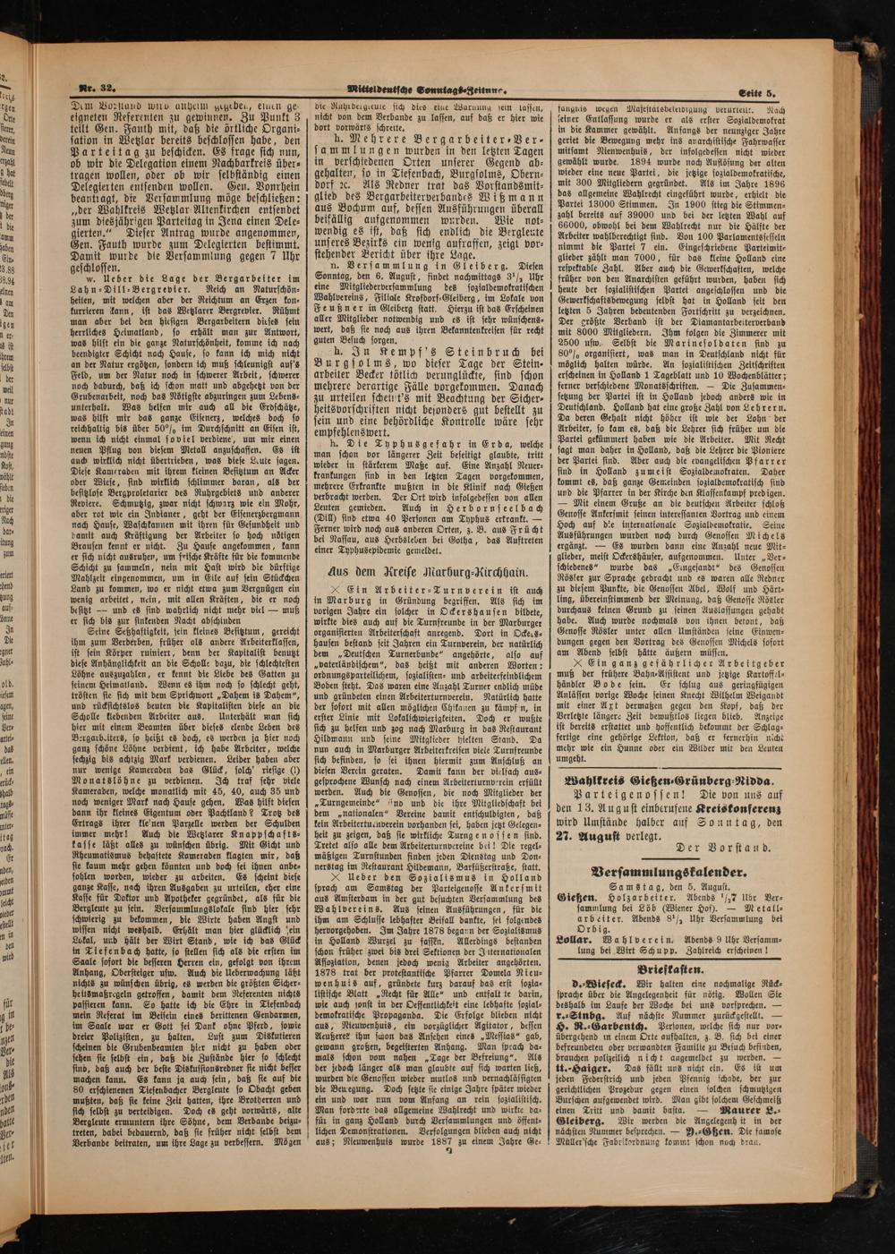 n. Versammlung in Gleiberg. Diesen Sonntag, den 6. August, findet nachmittags 3/ Uhr eine Mitgliederversammlung des sozialdemokratischen Wahlvereins, Filiale Krofdorf⸗Gleiberg, im Lokale von Feußner in Gleiberg statt. Hierzu ist das Erscheinen aller Mitglieder notwendig und es ist sehr wünschens⸗ wert, daß sie noch aus ihren Bekanntenkreisen für recht guten Besuch sorgen.
