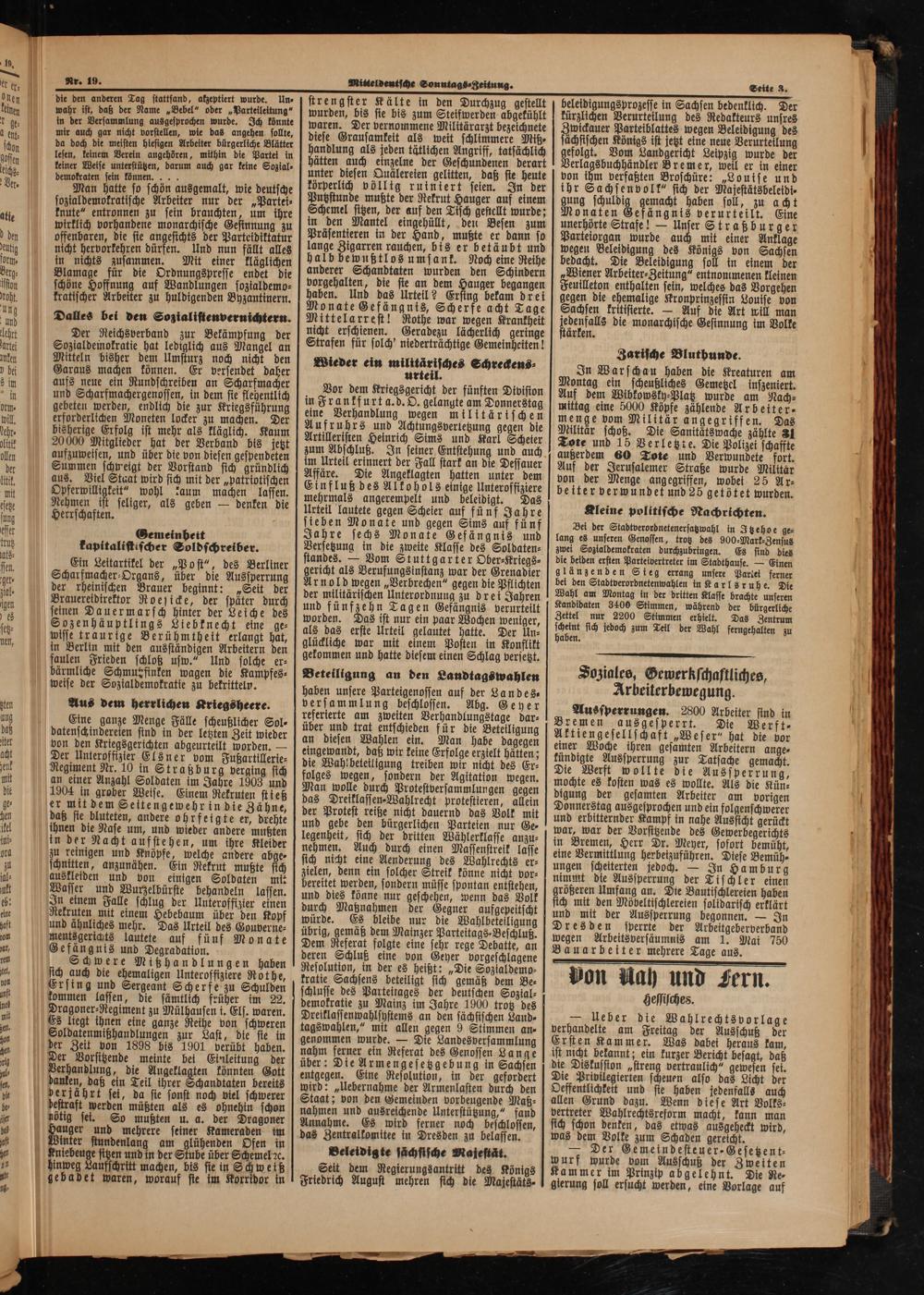 beleidigungsprozesse in Sachsen bedenklich. Der kürzlichen Verurteilung des Redakteurs unsres Zwickauer Parteiblattes wegen Beleidigung des säͤchsischen Königs ist jetzt eine neue Verurteilung gefolgt. Vom Landgericht Leipzig wurde der Verlagsbuchhändler Bremer, weil er in einer von ihm verfaßten Broschüre:„Louise und ihr Sachsenbolk“ sich der Majestätsbeleidi⸗ gung schuldig gemacht haben soll, zu acht Monaten Gefeugnis verurteilt. Eine unerhörte Strafe!— 15 90 Straßburger Parteiorgan wurde auch mit einer Anklage wegen Beleidigung des Königs von Sachsen bedacht. Die Beleidigung soll in einem der Wiener Arbeiter⸗Zeitung“ entnommenen kleinen Feuilleton enthalten sein, welches das Vorgehen gegen die ehemalige Kronprinzessin Louise von Sachsen kritisterte.— Auf die Art will man Kate die monarchische Gesinnung im Volke ärken.