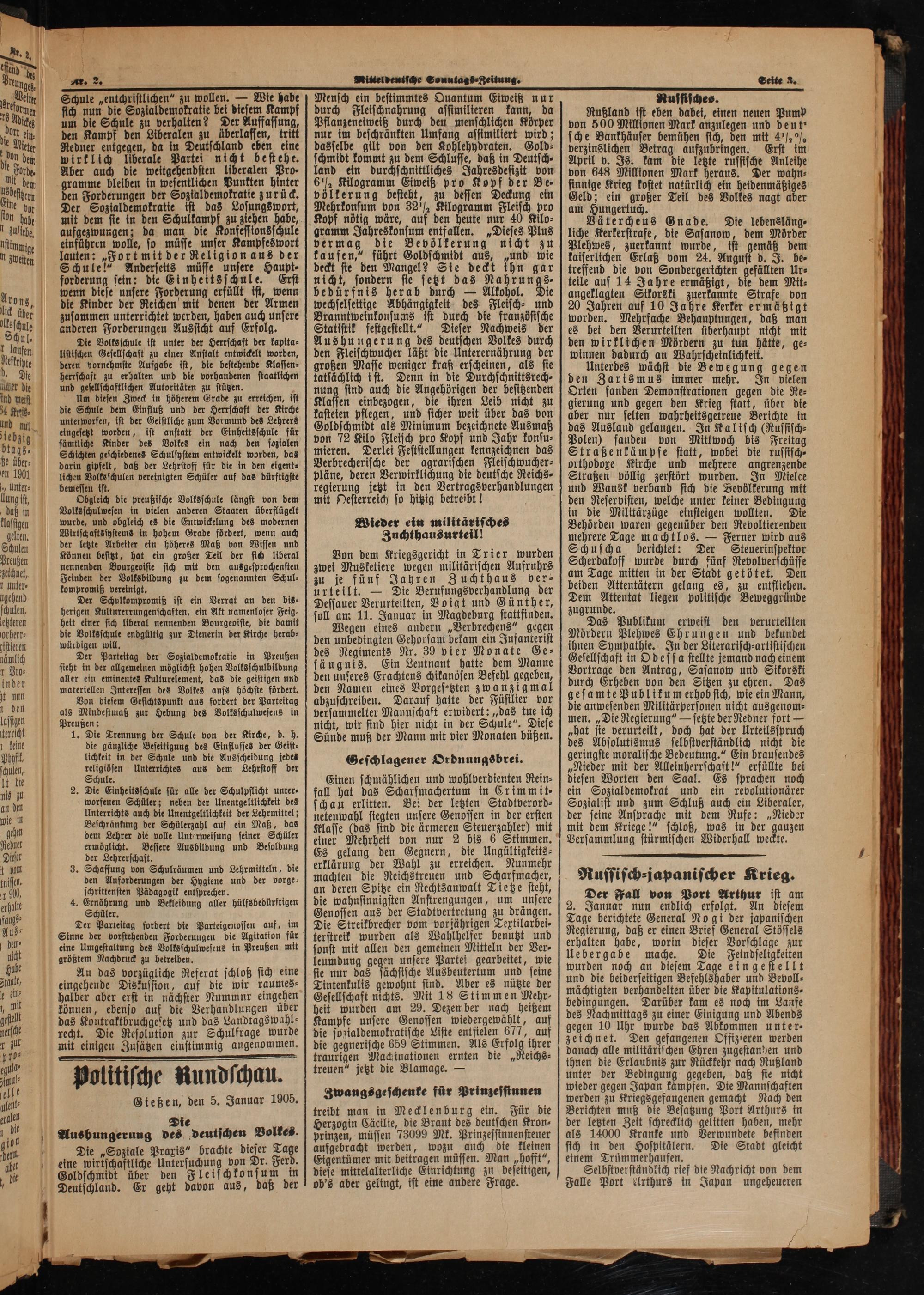 Der Fall von Port Arthur ist am 2. Januar nun endlich erfolgt. An diesem Tage berichtete General Nogi der japanischen Regierung, daß er einen Brief General Stössels erhalten habe, worin dieser Vorschlaäͤge zur Uebergabe mache. Die Feindseligkeiten wurden noch an diesem Tage eingestellt und die beiderseitigen Befehlshaber und Bevoll⸗ mächtigten verhandelten über die Kapitulations⸗ bedingungen. Darüber kam es noch im Laufe des Nachmittags zu einer Einigung und Abends gegen 10 Uhr wurde das Abkommen unter⸗ zeichnet. Den gefangenen Offizieren werden danach alle militärischen Ehren zugestanhen und ihnen die Erlaubnis zur Rückkehr nach Rußland unter der Bedingung gegeben, daß ste nicht wieder gegen Japan kämpfen. Die Mannschaften werden zu Kriegsgefangenen gemacht Nach den Berichten muß die Besatzung Port Arthurs in der letzten Zeit schrecklich gelitten haben, mehr als 14000 Kranke und Verwundete befinden sich in den Hospitälern. Die Stadt gleicht einem Trümmerhaufen.