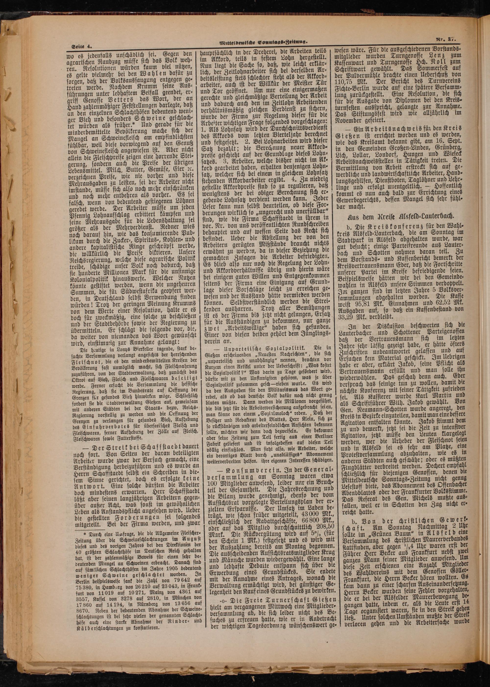 b. Von der christlichen Gewerk⸗ schaft. Am Sonntag Nachmittag 2 Uhr sollte im„Grünen Baum“ in Alsfeld eine Versammlung des christlichen Maurerverbandes stattfinden, aber gegen 4 Uhr waren erst der Führer Herr Becker aus Frankfurt nebst zwei ganzen Mann seiner Mitglieder anwesend. Um diese Zeit erschienen eine Anzahl Mitglieder des Wahlvereins mit dem Genossen öller⸗ Frankfurt, die Herrn Becker hören wollten. Es kam dann zu einer scharfen Auseinandersetzung. Herrn Becker wurden seine Fehler vorgehalten, die er bei der Alsfelder Maurerbewegung be⸗ gangen hatte, indem er, als die Leute erst 14 Tage organistert waren, ste in den Streik gehen ließ. Unter solchen Umständen mußte der Streik verloren gehen und die Arbeitersache wurde