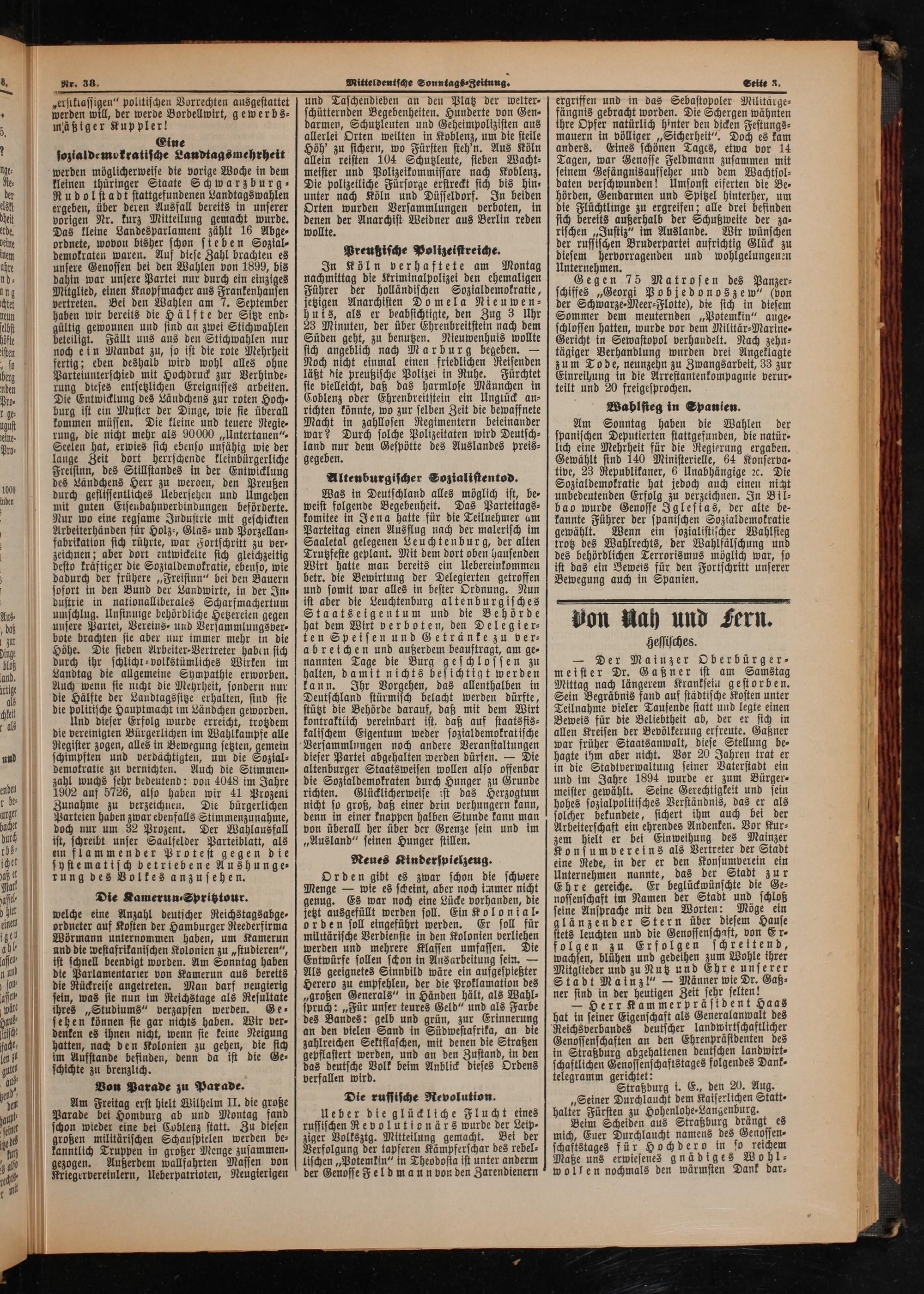 kleinen thüringer Staate Schwarzburg⸗ Rudolstadt stattgefundenen Landtagswahlen ergeben, über deren Ausfall bereits in unserer vorigen Nr. kurz Mitteilung gemacht wurde. Das kleine Landesparlament zählt 16 Abge⸗ ordnete, wovon bisher schon sieben Sozial⸗ demokraten waren. Auf diese Zahl brachten es unsere Genossen bei den Wahlen von 1899, bis dahin war unsere Partei nur durch ein einziges Mitglied, einen Knopfmacher aus Frankenhausen vertreten. Bei den Wahlen am 7. September haben wir bereits die Hälfte der Sitze end⸗ gültig gewonnen und sind an zwei Stichwahlen beteiligt. Fällt uns aus den Stichwahlen nur noch ein Mandat zu, so ist die rote Mehrheit fertig; eben deshalb wird wohl alles ohne Parteiunterschied mit Hochdruck zur Verhinde⸗ rung dieses entsetzlichen Ereignisses arbeiten. Die Entwicklung des Ländchens zur roten Hoch⸗ burg ist ein Muster der Dinge, wie sie überall kommen müssen. Die kleine und teuere Regie⸗ rung, die nicht mehr als 90000„Untertanen“ Seelen hat, erwies sich ebenso unfähig wie der lange Zeit dort herrschende kleinbürgerliche Fressinn, des Stillstandes in der Entwicklung des Ländchens Herr zu werden, den Preußen durch geflissentliches Uebersehen und Umgehen mit guten Eisenbahnverbindungen beförderte. Nur wo eine regsame Industrie mit geschickten Arbeiterhänden für Holz⸗, Glas- und Porzellan⸗ fabrikation sich rührte, war Fortschritt zu ver⸗ zeichnen; aber dort entwickelte sich gleichzeitig desto kräftiger die Soztaldemokratie, ebenso, wie dadurch der frühere„Freisinn“ bei den Bauern sofort in den Bund der Landwirte, in der In⸗ dustrie in nationalliberales Scharfmachertum umschlug. Unsinnige behördliche Hetzereien gegen unsere Partei, Vereins⸗ und Versammlungsver⸗ bote brachten sie aber nur immer mehr in die Höhe. Die sieben Arbeiter⸗Vertreter haben sich durch ihr schlicht⸗volkstümliches Wirken im Landtag die allgemeine Sympathie erworben. Auch wenn sie nicht die Mehrheit, sondern nur die Hälfte der Landtagssitze erhalten, sind sie die politische Hauptmacht im Ländchen geworden.