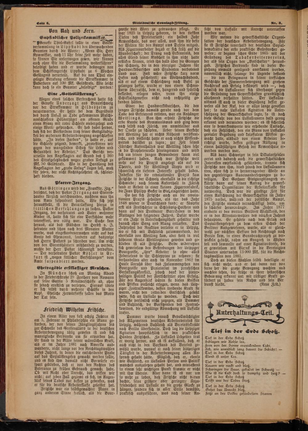 Als dann Schweizer in sein Diktatorspielen geriet und dadurch auch die gewerkschaftlichen Interessen empfindlich gefährdete, trennte sich Fritzsche von ihm, blieb jedoch den Lassalleanern treu, ohne sich je in hervorragender Weise an den gegenseitigen Auseinandersetzungen zu be⸗ teiligen. Der Gothaer Einigungskongreß er⸗ klärte dann auf seinen Antrag die gewerk⸗ schaftliche Organisation der Arbeiterklasse für notwendig. Doch war die günstige Zeit für einen Aufschwung der Gewerkschaften im Jahre 1875 vorbei, während der politische Kampf, den Fritzsche niemals vernachlässigt hatte, um so schärfer herandrängte. Im Jahre 1877 eroberte er den vierten Berliner Wahlkreis, den er in den Attentatswahlen des nächsten Jahres behauptete. Er gehörte nach dem Erlaß des Sozialistengesetzes zu dem ersten Schub der Berliner Ausgewiesenen, wurde, als er gleich⸗ wohl zur nächsten Session des Reichstags nach Berlin kam, in einen Bannbruchprozeß zu ver⸗ wickeln gesucht, nahm am Kongreß in Wyden teil und sammelte auf einer Agtitationsreise, die er gemeinsam mit Viereck in die Vereinigten Staaten unternahm 13 000 Mk. für die Reichs⸗ tagswahlen von 1881.