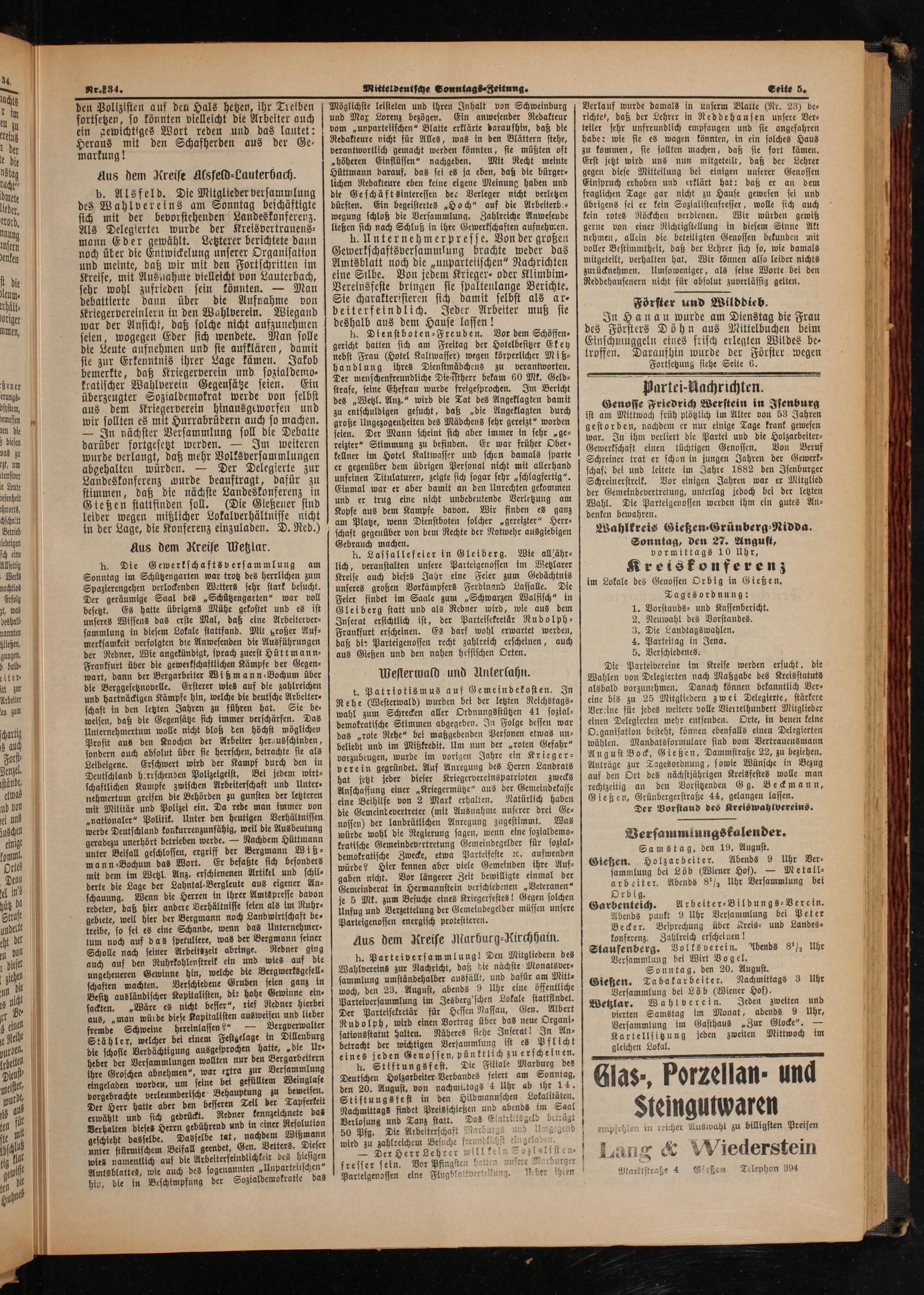 h. Parteiversammlung! Den Mitgliedern des Wahlvereins zur Nachricht, daß die nächste Monatsver⸗ sammlung umständehalber ausfällt, und dafür am Mitt⸗ woch, den 23. August, abends 9 Uhr eine öffentliche Parteiversammlung im Jesberg'schen Lokale stattfludet. Der Parteisekretär für Hessen Nassau, Gen. Albert Rudolph, wird einen Vortrag über das neue Organi⸗ sationsstatut alten. Näheres siehe Inserat! In An⸗ betracht der wichtigen Versammlung ist es Pflicht eines jeden Genossen, pünktlich zu erscheinen.