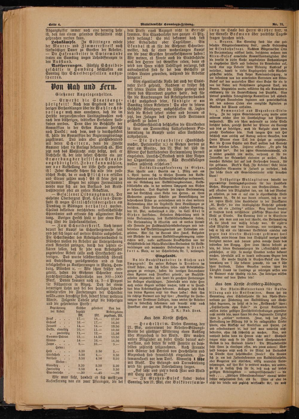 — Zum Schneiderstreik. Noch immer dauert der Kampf im Schneidergewerbe fort und hat sich sogar auf weitere Städte ausgedehnt. Die Scharfmacher des Arbeitgeberverbandes in München wollen die Arbeiter zur Unterzeichnung eines Reverses zwingen, durch den letztere er⸗ klären sollen, daß sie jede vom Arbeitgeber zugewiesene Arbeit(also auch Streikarbeit) an⸗ fertigen. Das wurde selbstverständlich überall mit Entrüstung zurückgewiesen und es kam infolgedessen zu Aussperrungen in Mainz, Ham⸗ burg, München ꝛc.— Wie schon früher mit⸗ geteilt, haben die Gießener Schneider einen durchschnittlichen Jahreslohn von 9001000 Mark.„Davon kommen noch ca. 3—4 Prozent für Nähzutalen in Abzug. Daß bei einem derartigen Lohn und bei den heutigen Lebens⸗ mittelpreisen die Forderungen der Schneider vollko tamen berechtigt sind, bedarf keiner weiteren Worte. Folgende Tabelle zeigt die bisherigen und die geforderten Prelse: