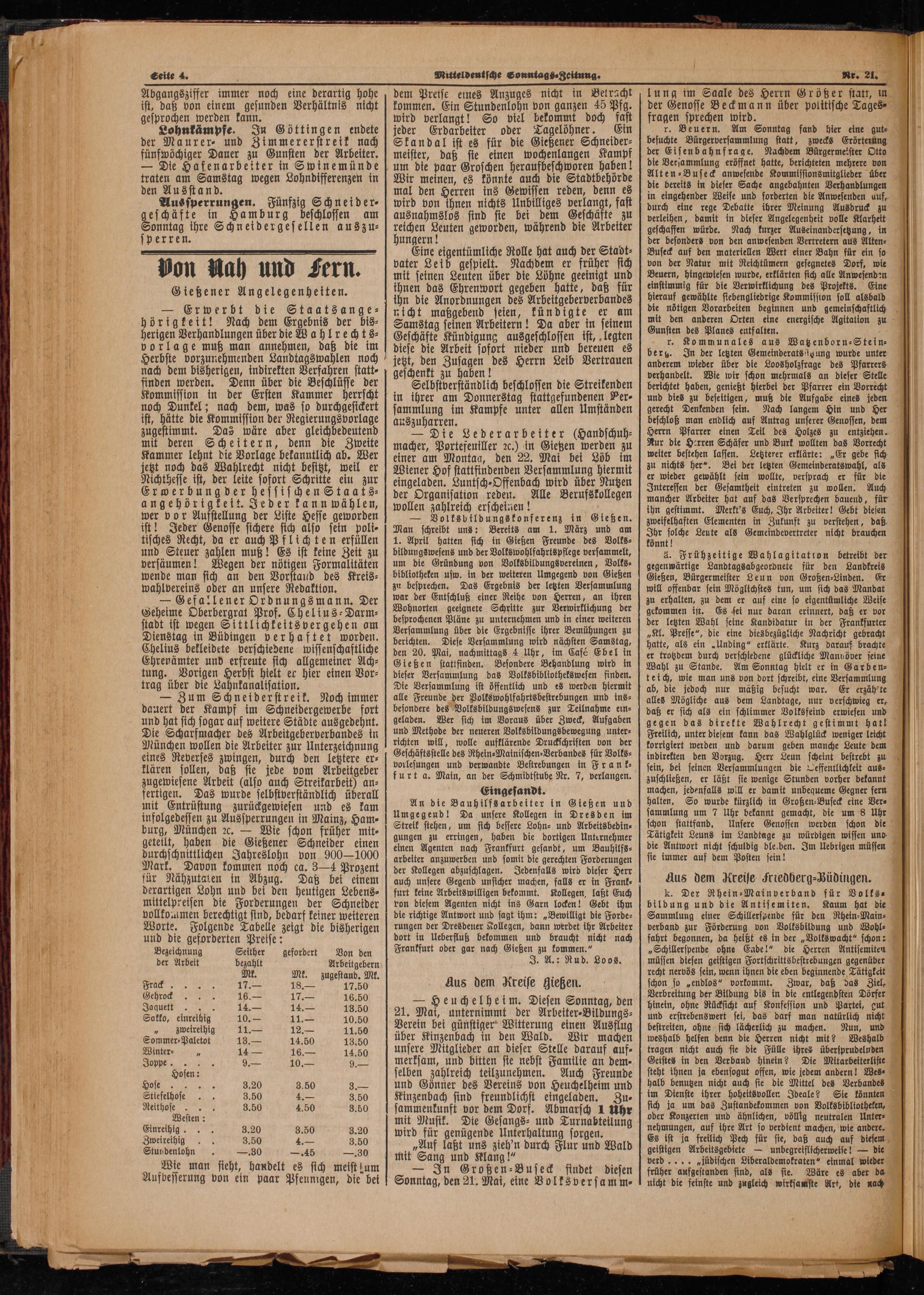 — Die Lederarbeiter(Handschuh⸗ macher, Portefeuiller ꝛc.) in Gießen werden zu einer am Montag, den 22. Mai bei Löb im Wiener Hof stattfindenden Versammlung hiermit eingeladen. Luntsch⸗Offenbach wird über Nutzen der Organisation reden. Alle Berufskollegen wollen zahlreich erscheinen! a