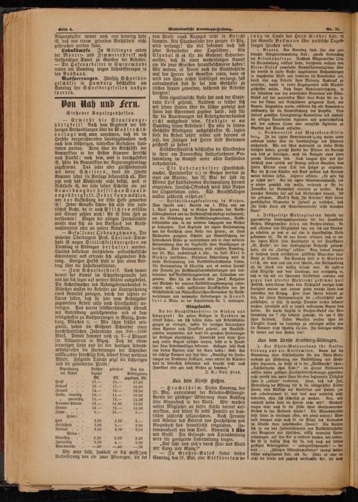 — Volksbildungskonferenz in Gießen. Man schreibt uns: Bereits am 1. März und am 1. April hatten sich in Gießen Freunde des Volks⸗ bildungswesens und der Volkswohlfahrtspflege versammelt, um die Gründung von Volksbildungsvereinen, Volks⸗ bibliotheken usw. in der weiteren Umgegend von Gießen zu besprechen. Das Ergebnis der letzten Versammlung war der Entschluß einer Reihe von Herren, an ihren Wohnorten geeignete Schritte zur Verwirklichung der besprochenen Pläne zu unternehmen und in einer weiteren Versammlung über die Ergebnisse ihrer Bemühungen zu berichten. Diese Versammlung wird nächsten Samstag, den 20. Mai, nachmittags 4 Uhr, im Café Ebel in Gießen stattfinden. Besondere Behandlung wird in dieser Versammlung das Volksbibliothekswesen finden. Die Versammlung ist öffentlich und es werden hiermit alle Freunde der Volkswohlfahrtsbestrebungen und ins⸗ besondere des Volksbildungswesens zur Teilnahme ein⸗ geladen. Wer sich im Voraus über Zweck, Aufgaben und Methode der neueren Volksbildungsbewegung unter⸗ richten will, wolle aufklärende Druckschriften von der Geschäftsstelle des Rhein⸗Mainischen⸗Verbandes für Volks⸗ vorlesungen und verwandte Bestrebungen in Frank⸗ furt a. Main, an der Schmidtstube Nr. 7, verlangen.