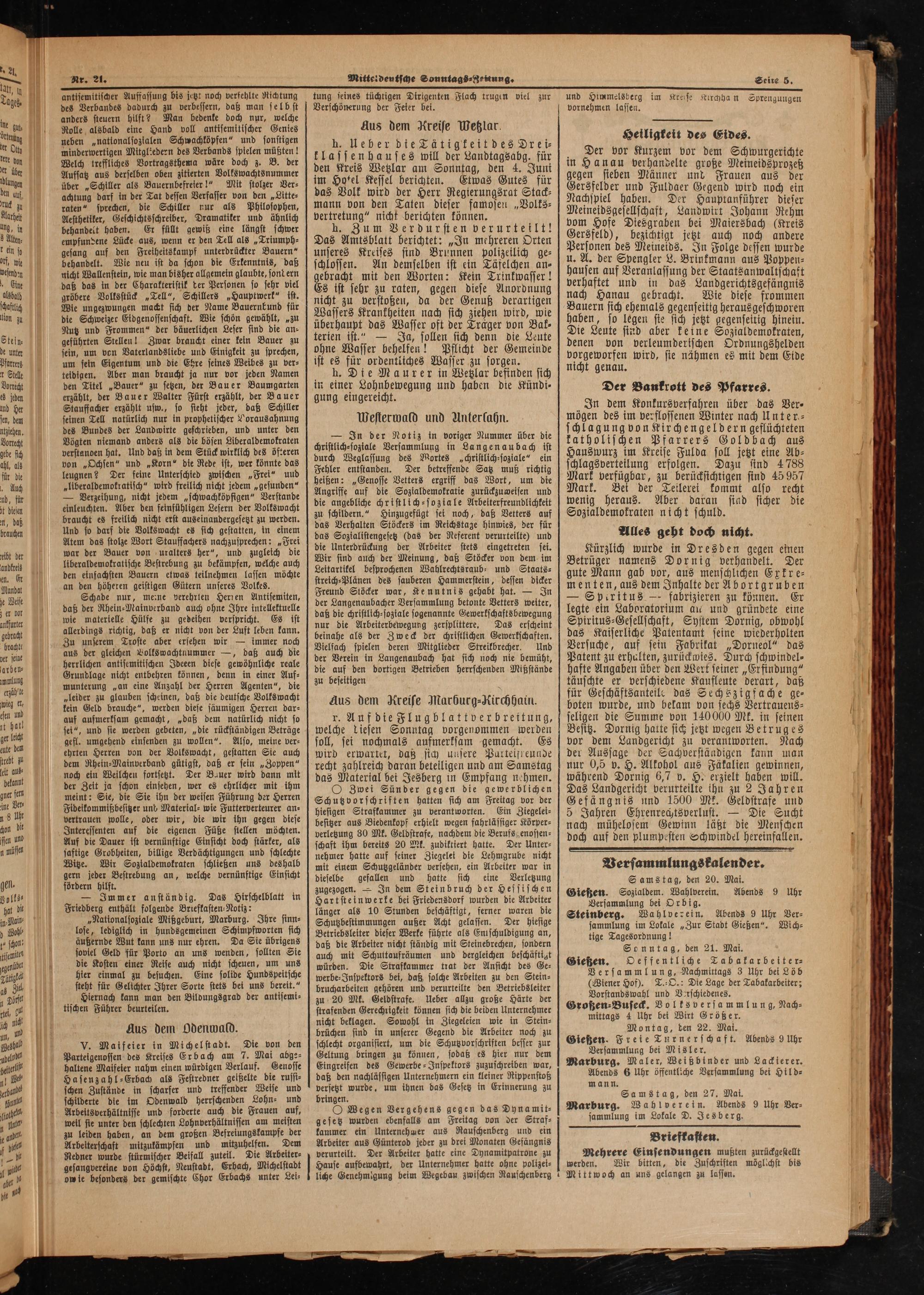 Der vor Kurzem vor dem Schwurgerichte in Hanau verhandelte große Meineidsprozeß gegen sieben Männer und Frauen aus der Gersfelder und Fuldaer Gegend wird noch ein Nachspiel haben. Der Hauptanführer dieser Meineidsgesellschaft, Landwirt Johann Rehm vom Hofe Diesgraben bei Maiersbach(Kreis Gersfeld), bezichtigt jetzt auch noch andere Personen des Meineids. In Folge dessen wurde u. A. der Spengler L. Brinkmann aus Poppen⸗ hausen auf Veranlassung der Staatsanwaltschaf verhaftet und in das Landgerichtsgefängnis nach Hanau gebracht. Wie diese frommen Bauern sich ehemals gegenseitig herausgeschworen haben, so legen ste sich jetzt gegenseitig hinein. Die Leute sind aber keine Sozialdemokraten, denen von verleumderischen Ordnungshelden vorgeworfen wird, sie nähmen es mit dem Eide nicht genau.