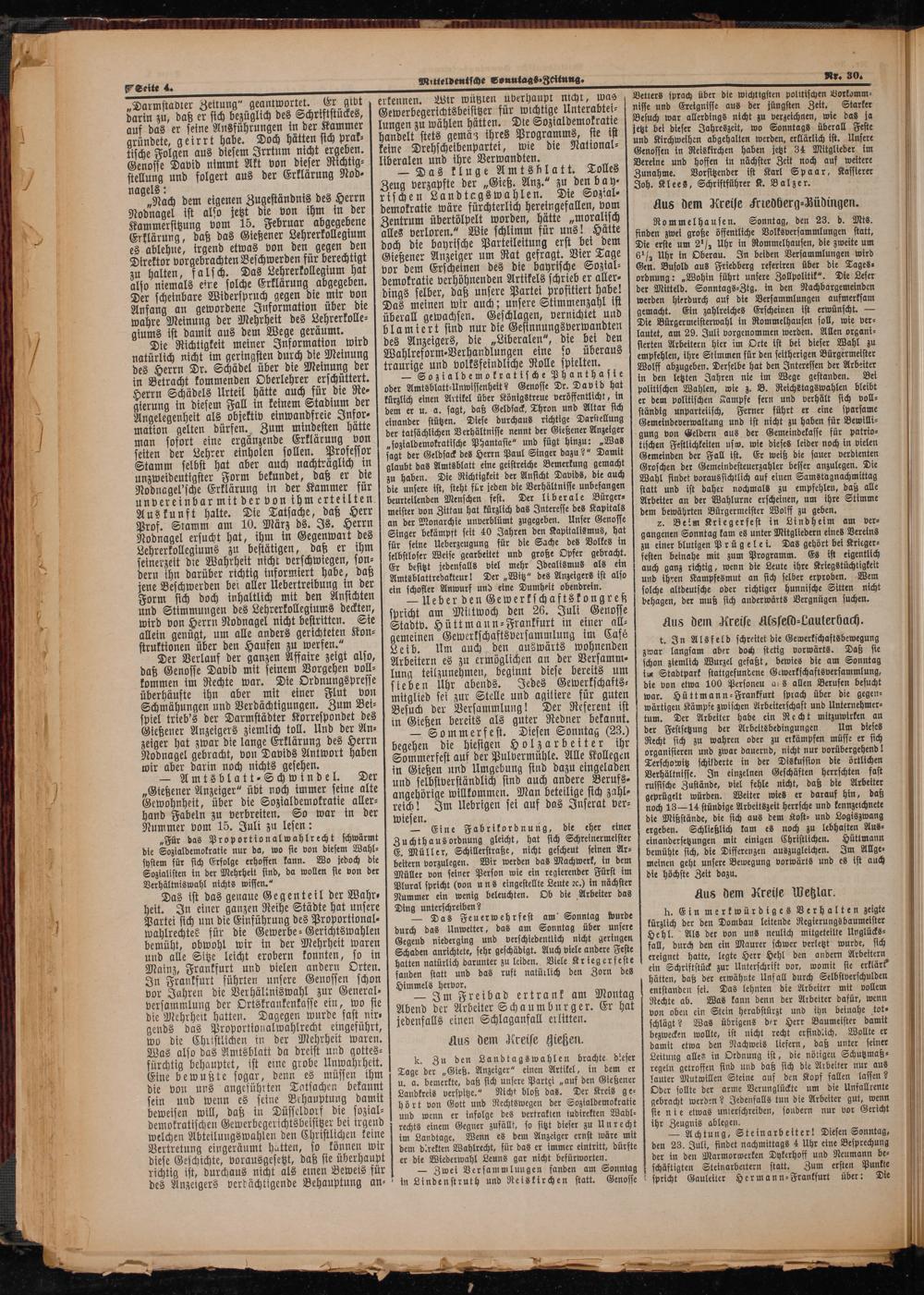 — Amtsblatt⸗Schwindel. Der „Gießener Anzeiger“ übt noch immer seine alte Gewohnheit, über die Sozialdemokratie aller⸗ hand Fabeln zu verbreiten. So war in der Nummer vom 15. Juli zu lesen: