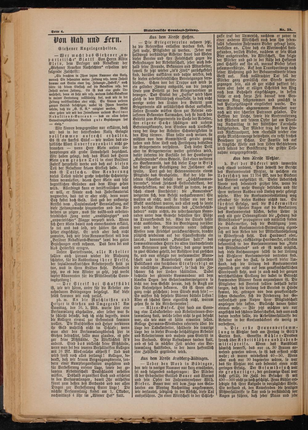 — Wer macht das Gießener„un⸗ parteiische“ Blatt? Von Herrn Albin Klein, dem Verleger und Redakteur der „Gießener Neuesten Nachrichten“ erhielten wir folgende Zuschrift: i
