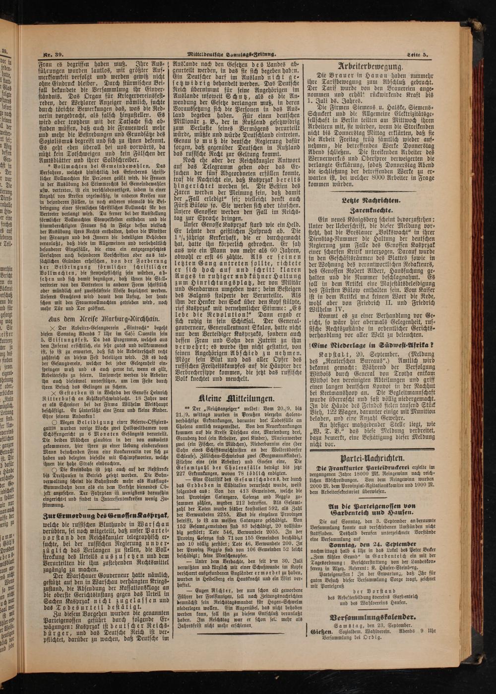 Samstag, den 23. September. Gießen. Sozialdem, Wahlverein. Abends Versammlung bei Orbig.