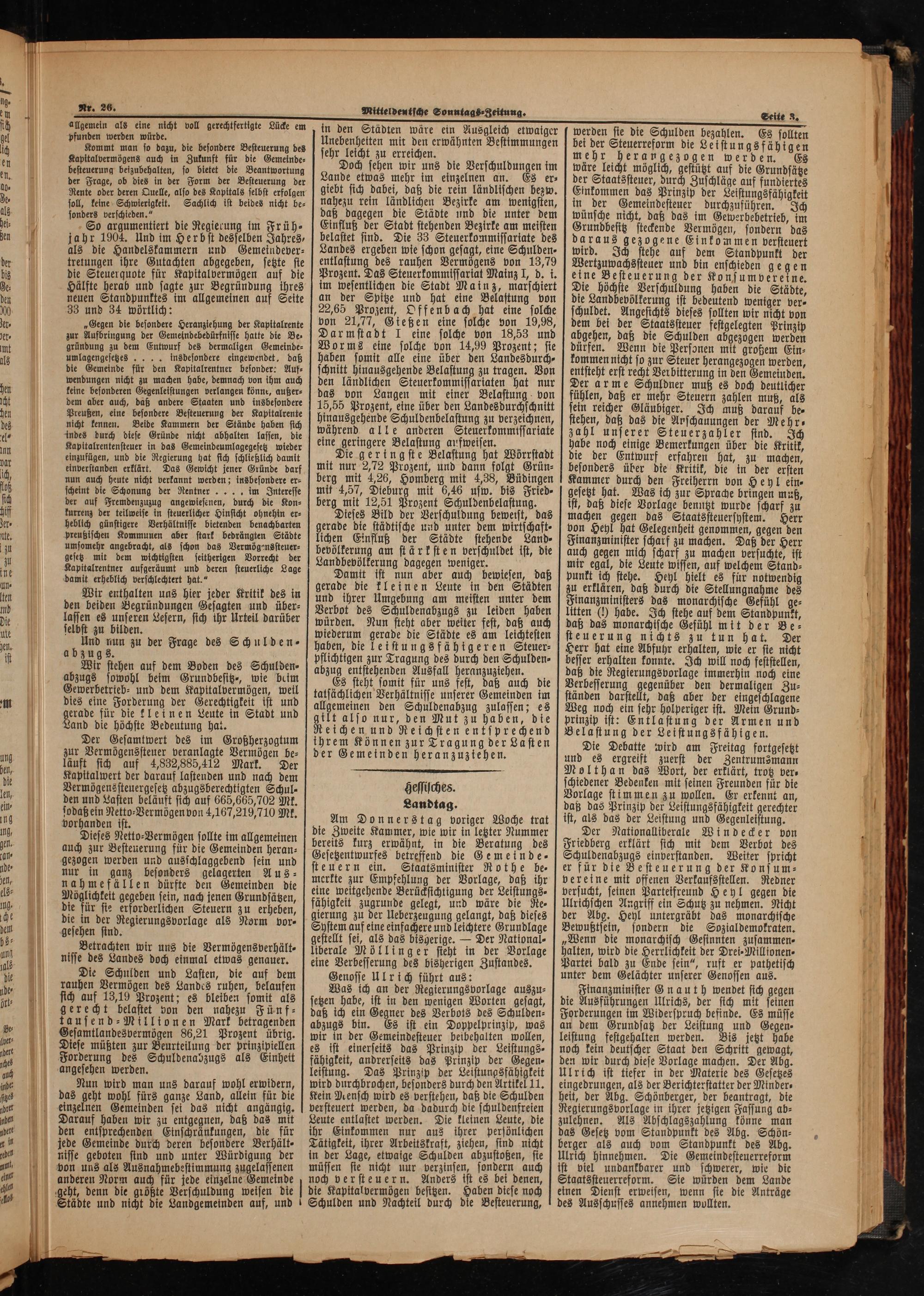 werden sie die Schulden bezahlen. Es sollten bei der Steuerreform die Leistungsfähigen mehr herangezogen werden. Es wäre leicht möglich, gestützt auf die Grundsätze der Staatssteuer, durch Zuschläge auf fundiertes Einkommen das Prinzip der Leistungsfähigkeit in der Gemeindesteuer durchzuführen. Ich wünsche nicht, daß das im Gewerbebetrieb, im Grundbesitz steckende Vermögen, sondern das daraus gezogene Einkommen versteuert wird. Ich stehe auf dem Standpunkt der Wertzuwachssteuer und bin enschieden gegen eine Besteuerung der Konsumvereine. Die höchste Verschuldung haben die Städte, die Landbevölkerung ist bedeutend weniger ver⸗ schuldet. Angesichts dieses sollten wir nicht von dem bei der Staatssteuer festgelegten Prinzip abgehen, daß die Schulden abgezogen werden dürfen. Wenn die Personen mit großem Ein⸗ kommen nicht so zur Steuer herangezogen werden, entsteht erst recht Verbitterung in den Gemeinden. Der arme Schuldner muß es doch deutlicher fühlen, daß er mehr Steuern zahlen muß, als sein reicher Gläubiger. Ich muß darauf be⸗ stehen, daß das die Apschauungen der Mehr⸗ zahl unserer Steuerzahler sind. Ich habe noch einige Bemerkungen über die Kritik, die der Entwurf erfahren hat, zu machen, besonders über die Kritik, die in der ersten Kammer durch den Freiherrn von Heyl ein⸗ gesetzt hat. Was ich zur Sprache bringen muß, ist, daß diese Vorlage benutzt wurde scharf zu machen gegen das Staatssteuersystem. Herr von Heyl hat Gelegenheit genommen, gegen den Finanzminister scharf zu machen. Daß der Herr auch gegen mich scharf zu machen versuchte, ist mir egal, die Leute wissen, auf welchem Stand⸗ punkt ich stehe. Heyl hielt es fur notwendig zu erklären, daß durch die Stellungnahme des Finanzministers das monarchische Gefühl ge⸗ litten() habe. Ich stehe auf dem Standpunkt, daß das monarchische Gefühl mit der Be⸗ steuerung nichts zu tun hat. Der Herr hat eine Abfuhr erhalten, wie er sie nicht besser erhalten konnte. Ich will noch feststellen, daß die Regierungsvorlage immerhin noch eine Verbesserung gegenüber den dermaligen Zu⸗ ständen darstellt, daß aber der eingeschlagene Weg noch ein sehr holperiger ist. Mein Grund⸗ prinzip ist: Entlastung der Armen und Belastung der Leistungsfähigen.