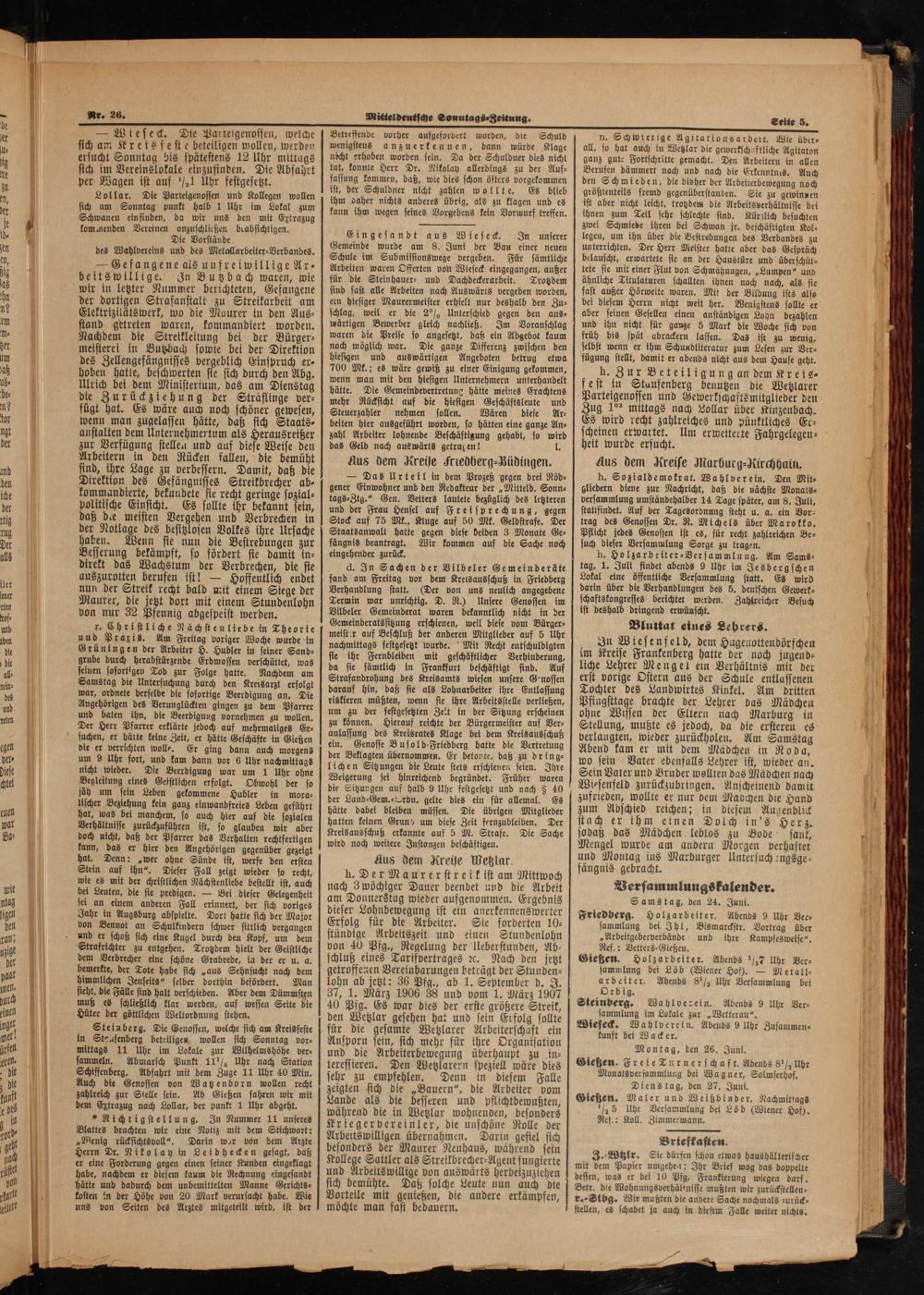 — Wieseck. Die Parreigenossen, welche sich am Kreis feste beteiligen wollen, werden ersucht Sonntag bis spätestens 12 Uhr mittags sich im Vereinslokale einzufinden. Die Abfahrt per Wagen ist auf/ 1 Uhr festgesetzt.
