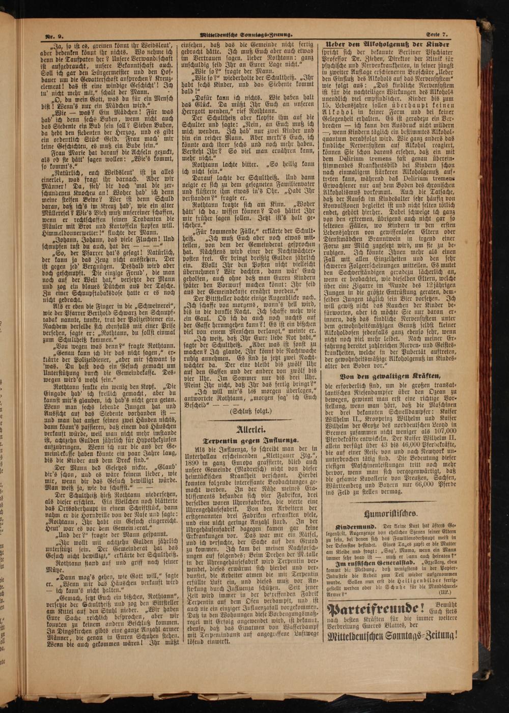 Ueber den Alkoholgenuß der Kinder spricht sich der bekannte Berliner Pspychiater Professor Dr. Ziehen, Direktor der Klinik für psychische und Nervenkrankheiten, in seiner jüngst in zweiter Auflage erschienenen Broschüre„Ueber den Einfluß des Alkohols auf das Nervensystem“ wie folgt aus:„Das kindliche Nervensystem ist für die nachteiligen Wirkungen des Alkohols unendlich viel empfindlicher. Kinder bis zum 15. Lebensjahre sollen überhaupt keinen Alkohol in keiner Form und bei keiner Gelegenheit erhalten. Es ist geradezu ein Ver⸗ brechen— ich kann den Ausdruck nicht mildern —, wenn Kindern täglich ein bestimmtes Alkohol⸗ quantum verabfolgt wird. Wie ganz anders das kindliche Nervensystem auf Alkohol reagiert, können Sie schon daraus ersehen, daß ein mit dem Delirium tremens fast genau überein- stimmendes Krankheitsbild bei Kindern schon nach einmaligem stärkeren Alkoholgenuß auf⸗ treten kann, während das Delirium tremens Erwachsener nur auf dem Boden des chronischen Alkoholtsmus vorkommt. Auch die Tatsache, daß der Rausch im Kindesalter sehr häufig von Konvulstonen begleitet ist und nicht selten tötlich endet, gehört hierher. Dabei schweige ich ganz von den extremen, übrigens auch nicht gar so selteuen Fällen, wo Kindern in den ersten Lebensjahren von gewissenlosen Eltern oder Dienstmädchen Branntwein in irgend einer Form zur Milch zugesetzt wird, um sie zu be⸗ ruhigen. Ich könnte Ihnen mehr als einen Fall mit allen Einzelheiten und den sehr schweren Folgeerscheinungen mitteilen. Es mutet den Sachverständigen geradezu lächerlich an, wenn er beobachtet, wie dieselben Eltern, welche über eine Zigarre im Munde des 12 jährigen Jungen in die größte Entrüstung geraten, dem⸗ selben Jungen täglich sein Bier vorsetzen. Ich will gewiß nicht das Rauchen der Kinder be⸗ fürworten, aber ich möchte Sie nux daran er⸗ innern, daß das kindliche Nervensystem unter dem gewohnheitsmäßigen Genuß selbst kleiner Alkoholdosen jedenfalls ganz ebenso sehr, wenn nicht noch viel mehr leidet. Nach meiner Er⸗ fahrung bereitet zahlreichen Nerven- und Geistes⸗ krankheiten, welche in der Pubertät auftreten, der gewohnheitsmäßige Alkoholgenuß im Kindes⸗ alter den Boden vor.“