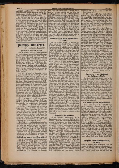 In den russischen Ostseeprovinzen hat der Bauernkrieg einen bedeutenden Umfang ange⸗ nommen. Man sucht ihn mit dem Belagerungs⸗ zustande zu bekämpfen, der über ganz Ku r⸗ land verhängt ist. Ebenso wurde über ganz Polen der verschärfte Kriegszustand verhängt und es soll gegen alle, die sich gegen„Ruhe und Ordnung“ vergehen, ein kriegsgerichtliches Verfahren eingeleitet werden.— In War⸗ schau, Odessa und anderen Orten protestiert das Volk unter Führung der Sozialdemokraten mittels des allgemeinen Ausstandes gegen die Volksverhöhnung die mit dem Ge⸗ setz betreffend die sogenannte Reichsduma (das Parlament) begangen wird. Viele Fa⸗ briken in Warschau stehen still, der Weichsel⸗ bahnbetrieb ist unterbrochen, auch auf der Bahn⸗ linie Warschau— Wien wurde der Betrieb ein⸗ geschränkt. Unter der Odessaer Arbeiterschaft herrscht wegen des Wahlzensus zur Reichsduma große Unzufriedenheit. Die Arbeiter fordern durch Flugblätter auf, den Kampf solange