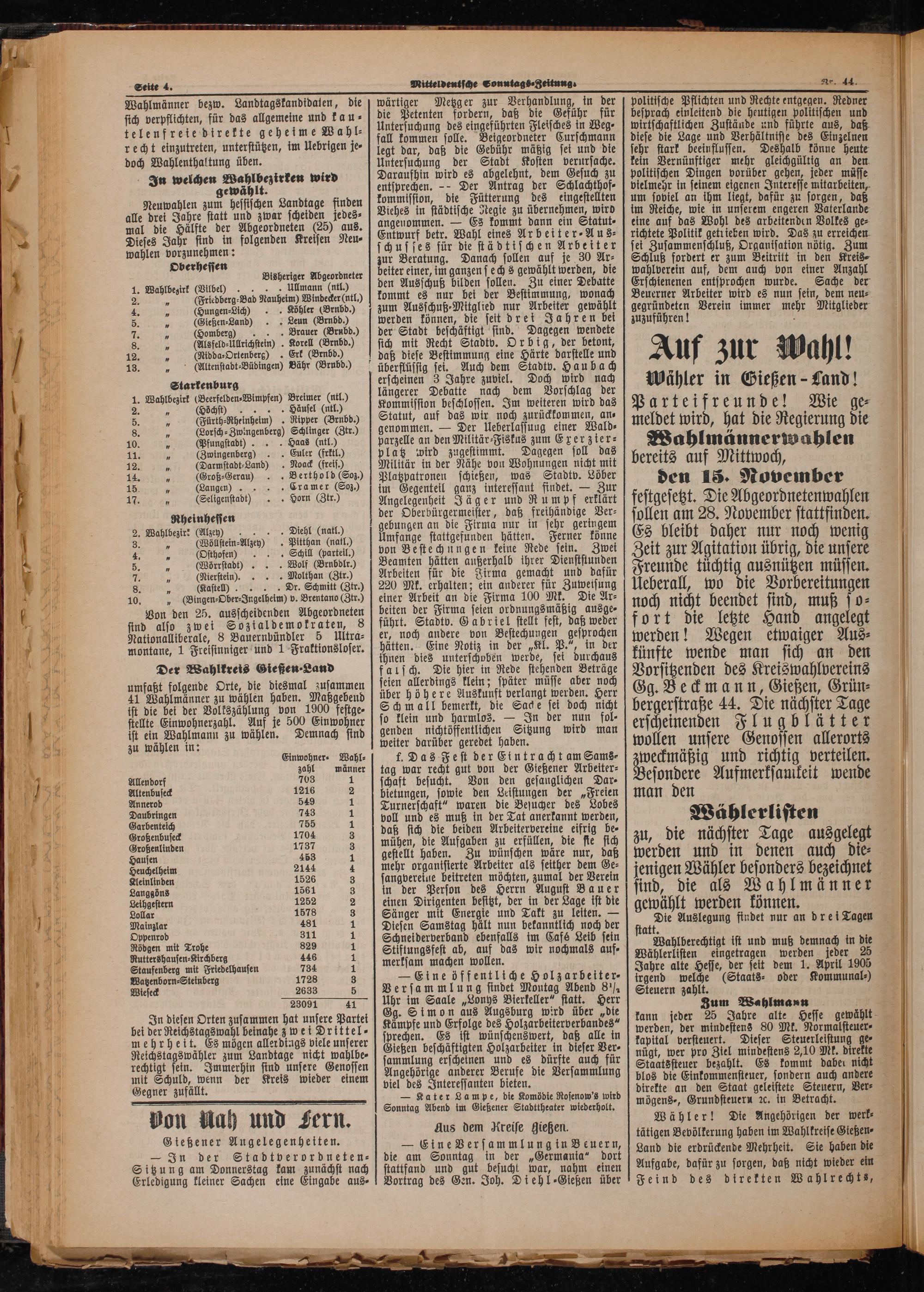 festgesetzt. Die Abgeordnetenwahlen sollen am 28. November stattfinden. Es bleibt daher nur noch wenig Zeit zur Agitation übrig, die unsere Freunde tüchtig ausnützen müssen. Ueberall, wo die Vorbereitungen noch nicht beendet sind, muß so⸗ fort die letzte Hand angelegt werden! Wegen etwaiger Aus⸗ künfte wende man sich an den Vorsitzenden des Kreiswahlvereins Gg. Beckmann, Gießen, Grün⸗ bergerstraße 44. Die nächster Tage erscheinenden Flugblätter wollen unsere Genossen allerorts Nesondede und richtig verteilen.