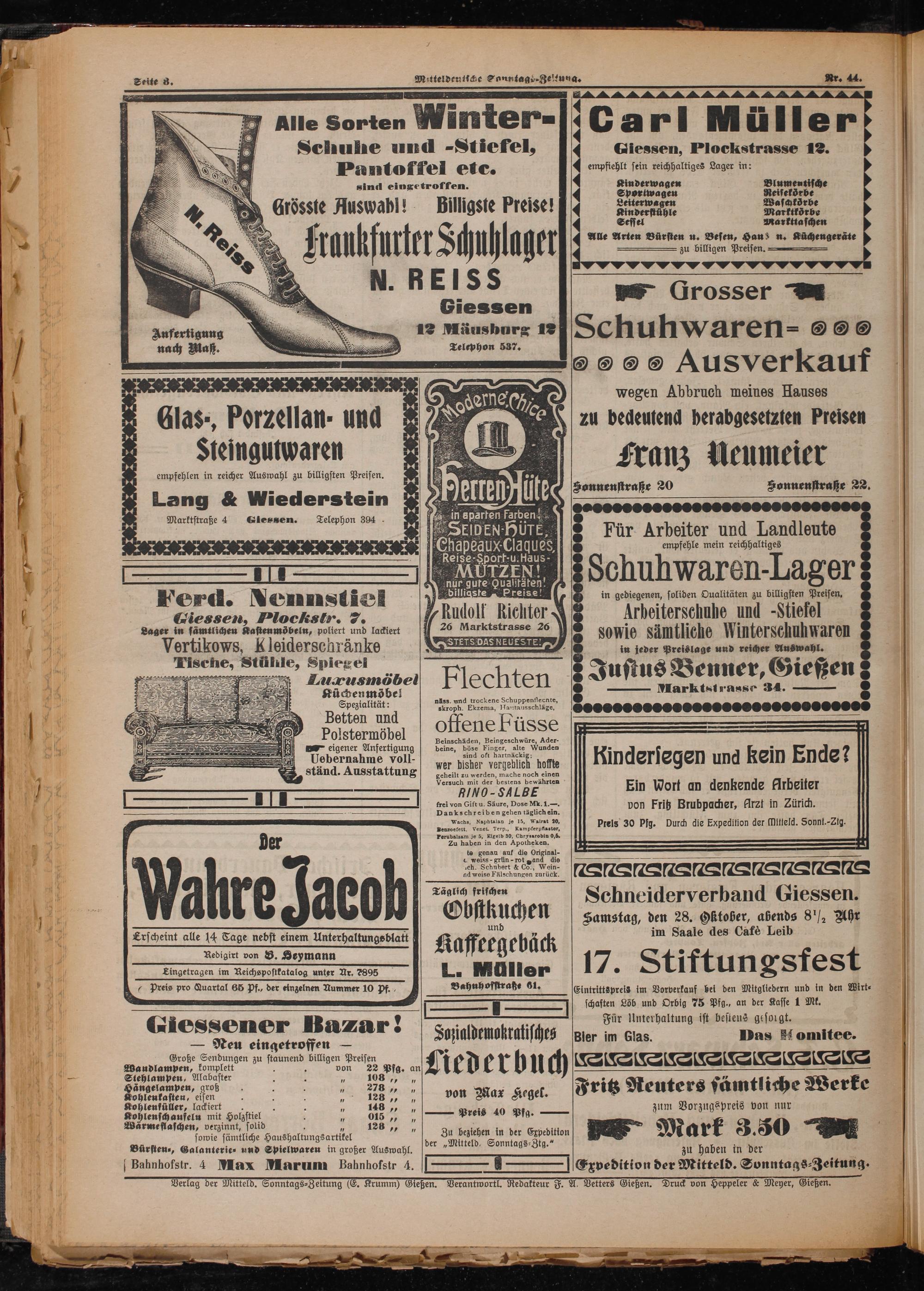 Verlag der Mitteld. Sonntags⸗Zeitung(E. Krumm) Gießen. Verantwortl. Redakteur F. A. Vetters Gießen. Druck von Heppeler& Meyer, Gießen.