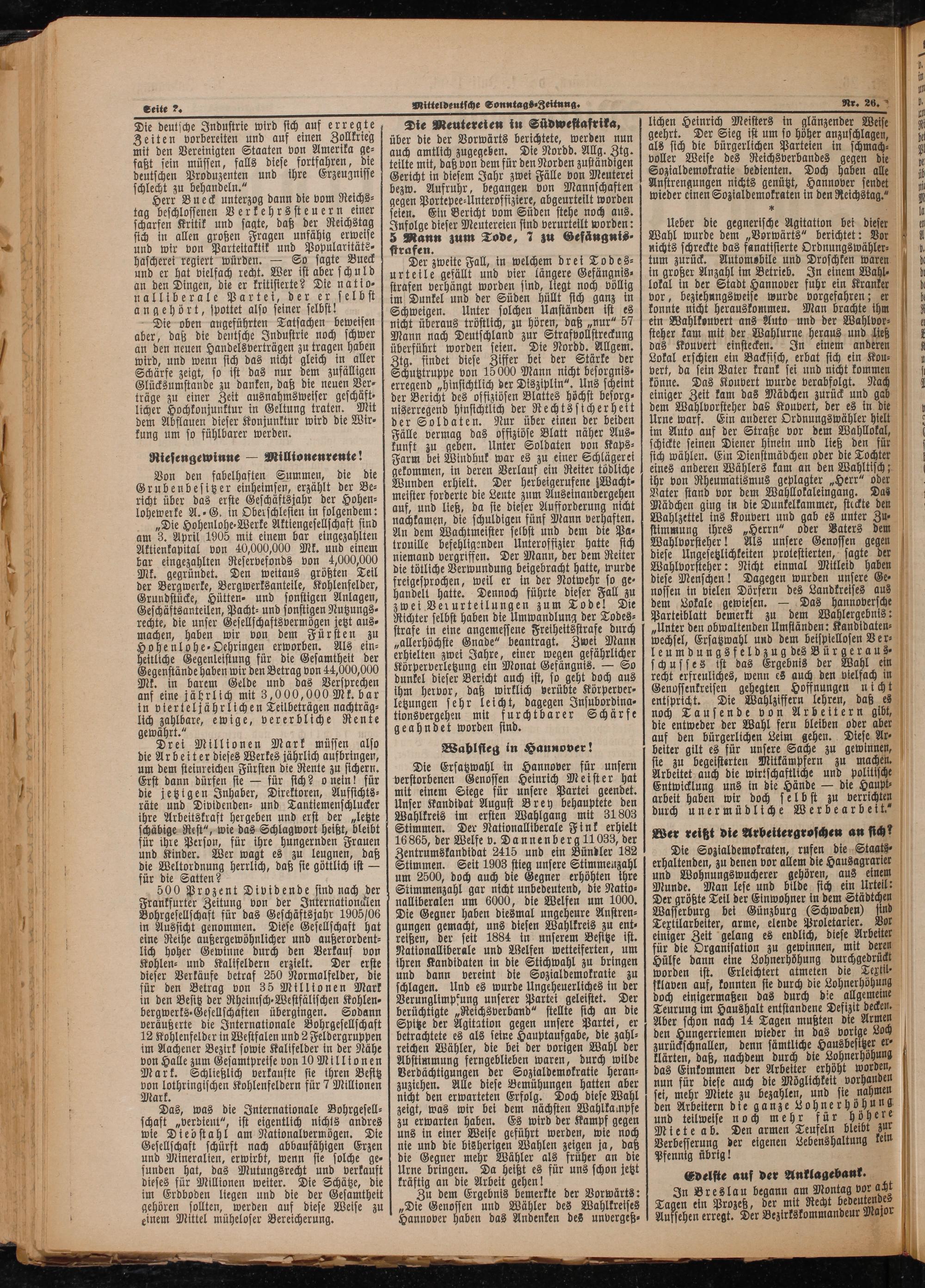 500 Prozent Dividende sind nach der Frankfurter Zeitung von der Internationdlen Bohrgesellschaft für das Geschäftsjahr 1905/6 in Aussicht genommen. Diese Gesellschaft hat eine Reihe außergewöhnlicher und außerordent⸗ lich hoher Gewinne durch den Verkauf von Kohlen⸗ und Kalifeldern erzielt. Der erste dieser Verkäufe betraf 250 Normalfelder, die für den Betrag von 35 Millionen Mark in den Besitz der Rheinisch⸗Westfälischen Kohlen⸗ bergwerks⸗Gesellschaften übergingen. Sodann veräußerte die Internationale Bohrgesellschaft 12 Kohlenfelder in Westfalen und 2 Feldergruppen im Aachener Bezirk sowie Kalifelder in der Nähe von Halle zum Gesamtpreise von 10 Millionen Mark. Schließlich verkaufte sie ihren Besttz 1. Kohlenfeldern für 7 Millionen