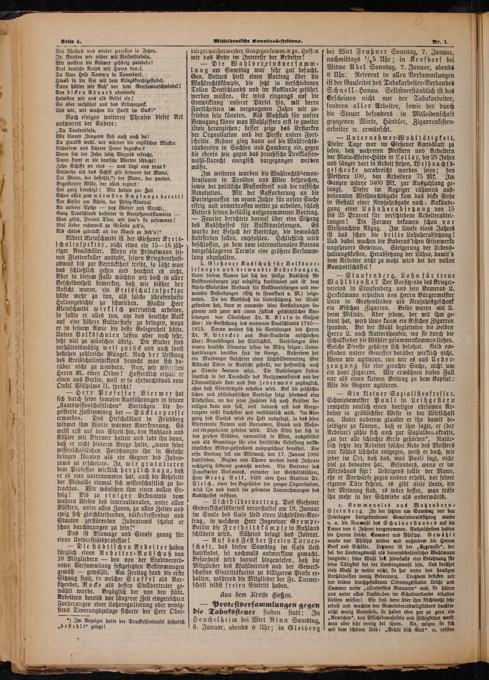 bei Wirt Feußner Sonntag, 7. Januar, nachmittags/ 5 Uhr; in Krofdorf bei Witwe Abel Sonntag, 7. Januar, abends 8 Uhr. Referent in allen Versammlungen ist der Gauleiter des Tabakarbeiter⸗Verbandes Schnell-Hanau. Selbstverständlich ist das Erscheinen nicht nur der Tabakarbeiter, sondern aller Arbeiter, sowie der durch die Steuer besonders in Mitleidenschaft gezogenen Wirte, Händler, Zigarrenkisten⸗ arbeiter ꝛc. erwünscht.