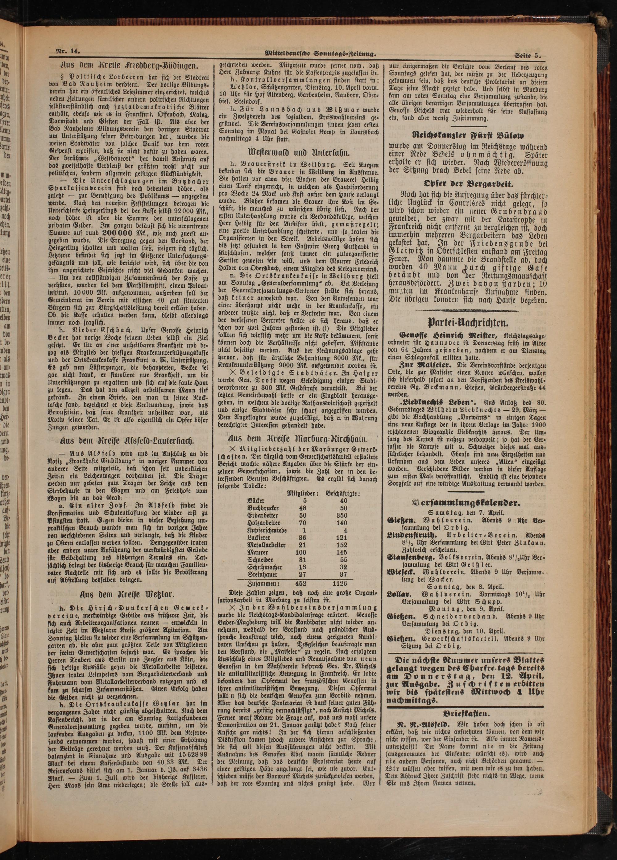 wurde am Donnerstag im Reichstage während einer Rede Bebels ohnmächtig. Später erholte er sich wieder. Nach Wiedereröffnung der Sitzung brach Bebel seine Rede ab.