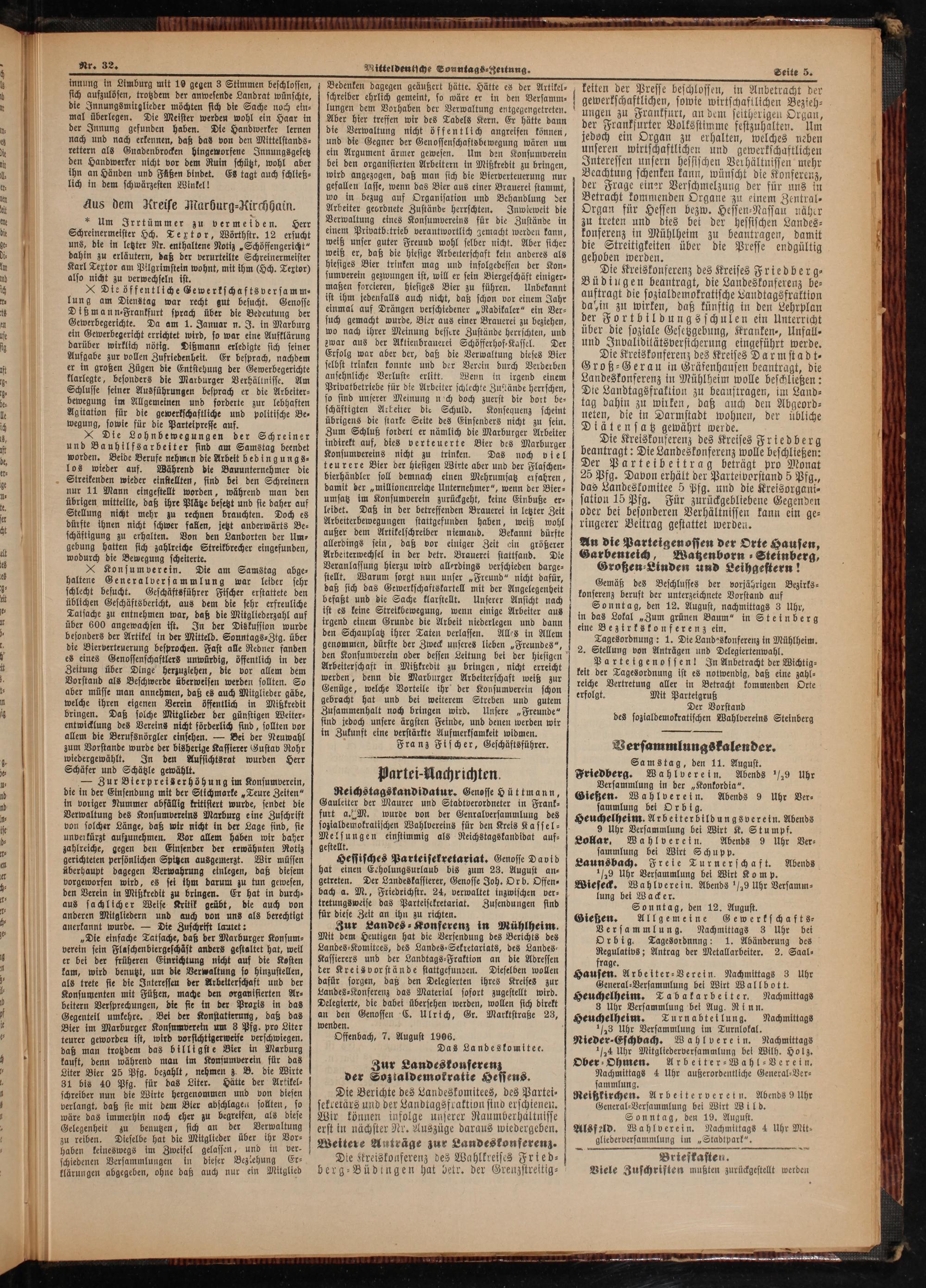 sammlung bei Wirt Schupp. Launsbach. Freie Turnerschaft. 9 Uhr Versammlung bei Wirt Ko m p. Wieseck. Wahlverein. Abends 9 Uhr Versamm⸗ lung bei Wacker. Sonntag, den 12. August. Gießen. Allgemeine Gewerkschafts⸗ Versammlung.