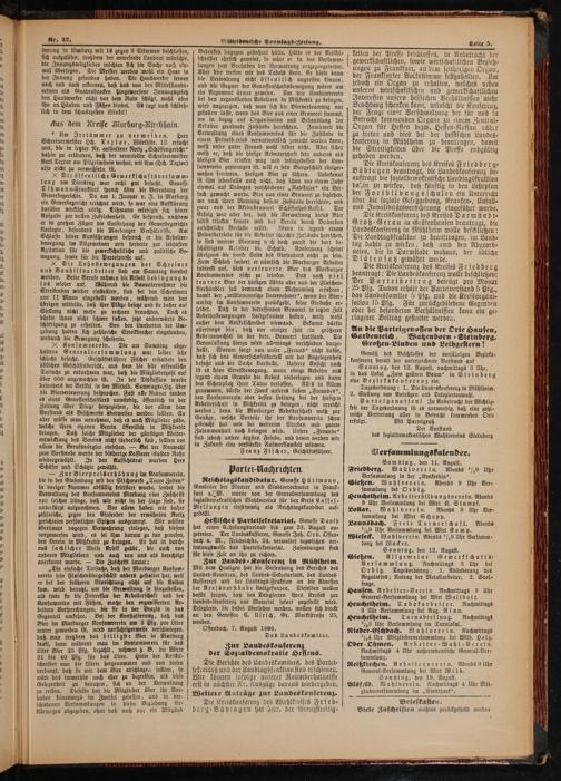 Samstag, den 11. August. Friedberg. Wahlverein. Abends ½9 Uhr Versammlung in der„Konkordia“. Gießen. Wahlverein. Abends 9 Uhr Ver⸗ sammlung bei Orbig.