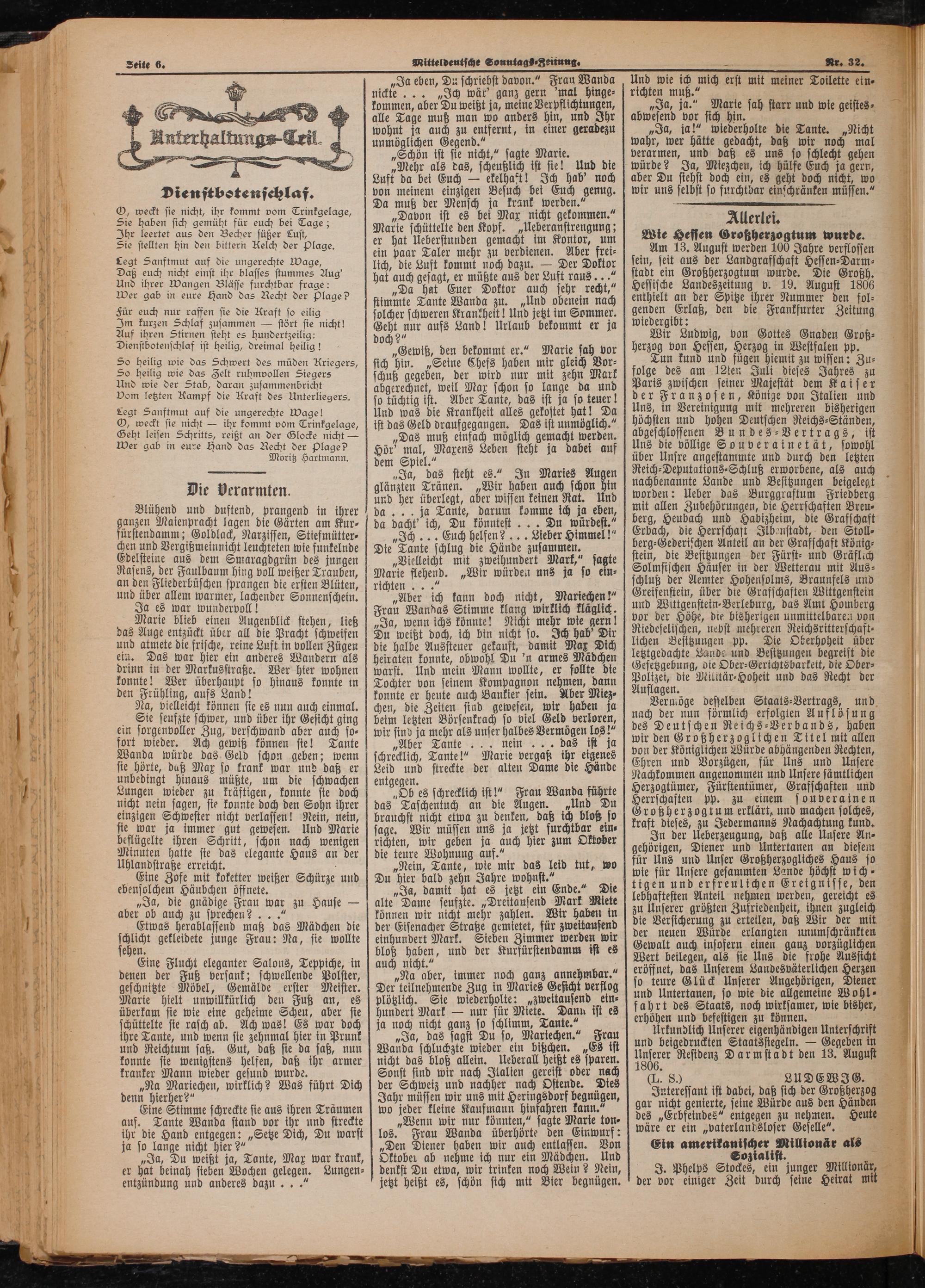 Am 13. August werden 100 Jahre verflossen sein, seit aus der Landgrafschaft Hessen⸗Darm⸗ stadt ein Großherzogtum wurde. Die Großh. Hessische Landeszeitung v. 19. August 1806 enthielt an der Spitze ihrer Nummer den fol⸗ genden Erlaß, den die Frankfurter Zeitung wiedergibt: