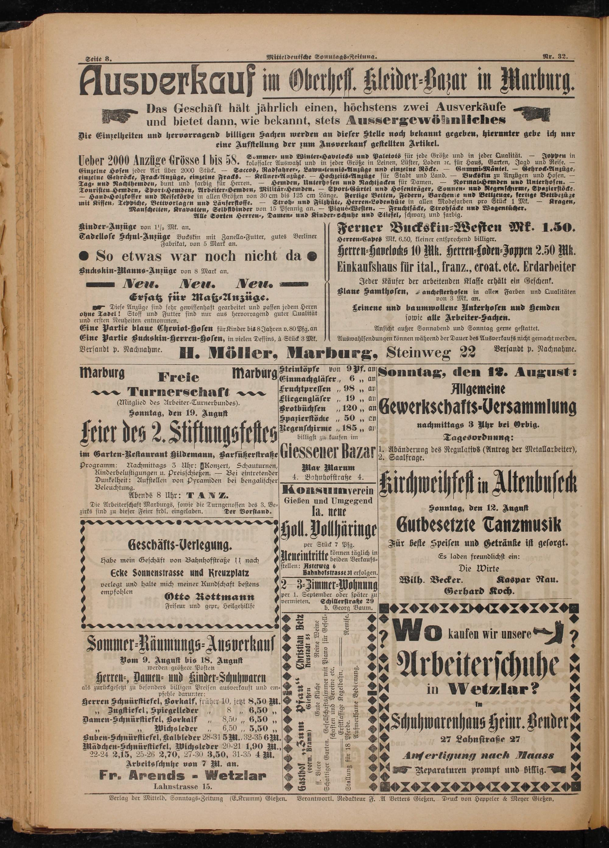 zirks sind zu dieser Feier frdl. eingeladen. Der Vorstand. la. neue Sonntag, den 12. August a . M“h e ede U 5. gol. Dollhäringe Cutbesetzte Tanzmusik Geschäfts-Uerlegung. ber 2 65 ale 191 Jür beste Speisen und Getränke ist gesorgt. Habe mein Geschäft von Bahnhofstraße 11 nach Aeueintlitte beben Verkaufs- es laden frendlicst en: ecke Sonnenstrasse und Rreuplatz Bahnbols tasse eriolgen.. Die Wirte 5 5 verlegt 1 halte mich meiner Kundschaft bestens 2 3⸗Zimmer⸗Wohnung Wilh. N 5 E 8 au. lee? cete nettmann ten cg e eee a VVV. e eee Deere ren S2 22 28 9 —..... 1 5 3 3 27 Wo kaufen wir ere 7 Sommer⸗Räumungs⸗Ausverkaus 23 75. 8 9. st bis 18. S 1 1 ch ee ee ee 2 8 5 1 22 rbeiter ü uhe 15 TfTTTTTTTTTT 25 in Wetzlar? Herren Schuürstiefel, Borkalf, früher 10, jetzt 8,50 M. O S 2 9 in „ Zugstiefel, Spiegelleder, 8„ 6,50„ 8 2 9 2 1 8 Damen-Schnürstiefel, Lorkalf„ 8,50„ 6,50„ i 9 n e be eee, e de, e i 2 Schuhwarenhaus Heint. Benderee Buben-Schnürstiefel Kalbleder 28.31 5 Nl. 32.35 6 M. H 66 27 Lahnstraße 27 8 Wißdchen-chnürftiefel. Wichsleder A. 190 N.& 23* 694* 22-24 2,15, 25.26 2,70, 27-30 3.50, 31-35 4 M. P ˙— e% Amerligung nach Hauss F S 23 2 54 D teparaturen prompt und billig. 4 Fr. Arends- Wetzlar 3 ĩ 8 Lahnstrasse 15. S eee Ge ee