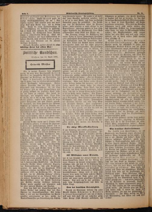 Wie in voriger Nummer kurz mitgeteilt wurde, ist unser alter Parteigenosse Heinrich Meister, der langjährige Vertreter der Stadt Hannover im Reichstage, am Donnerstag, den 5. April, in Hannover verstorben. Mit ihm ist wieder einer der ältesten und verdientesten unserer Vorkämpfer dahingegangen. Seinen näheren Freunden kam der Tod des alten Kameraden nicht überraschend. Er litt schon seit längerer Zeit an einer Herzverfettung und es gelang diesmal der ärztlichen Kunst nicht, ihn am Leben zu erhalten. Ein Zufall be⸗ schleunigte, wie mitgeteilt wird, seinen Tod. Er wurde, als er sich in den letzten Tagen in Berlin aufhielt, nachts 3 Uhr durch ein drin⸗ gendes Telegramm aus dem Schlafe geweckt. Er vermutete, von seiner Familie eine schlimme Nachricht zu erhalten; als er die Depesche ent⸗ faltete, enthielt sie eine auf die Zigarettensteuer bezugnehmende ganz gleichgiltige Nachricht aus Interessentenkreisen. Diese plötzliche Störung in der Nacht hat das Leiden unseres Genossen derart verschlimmert, daß er nach Hause reisen und ärztliche Hilfe in Anspruch nehmen mußte, aber umsonst.