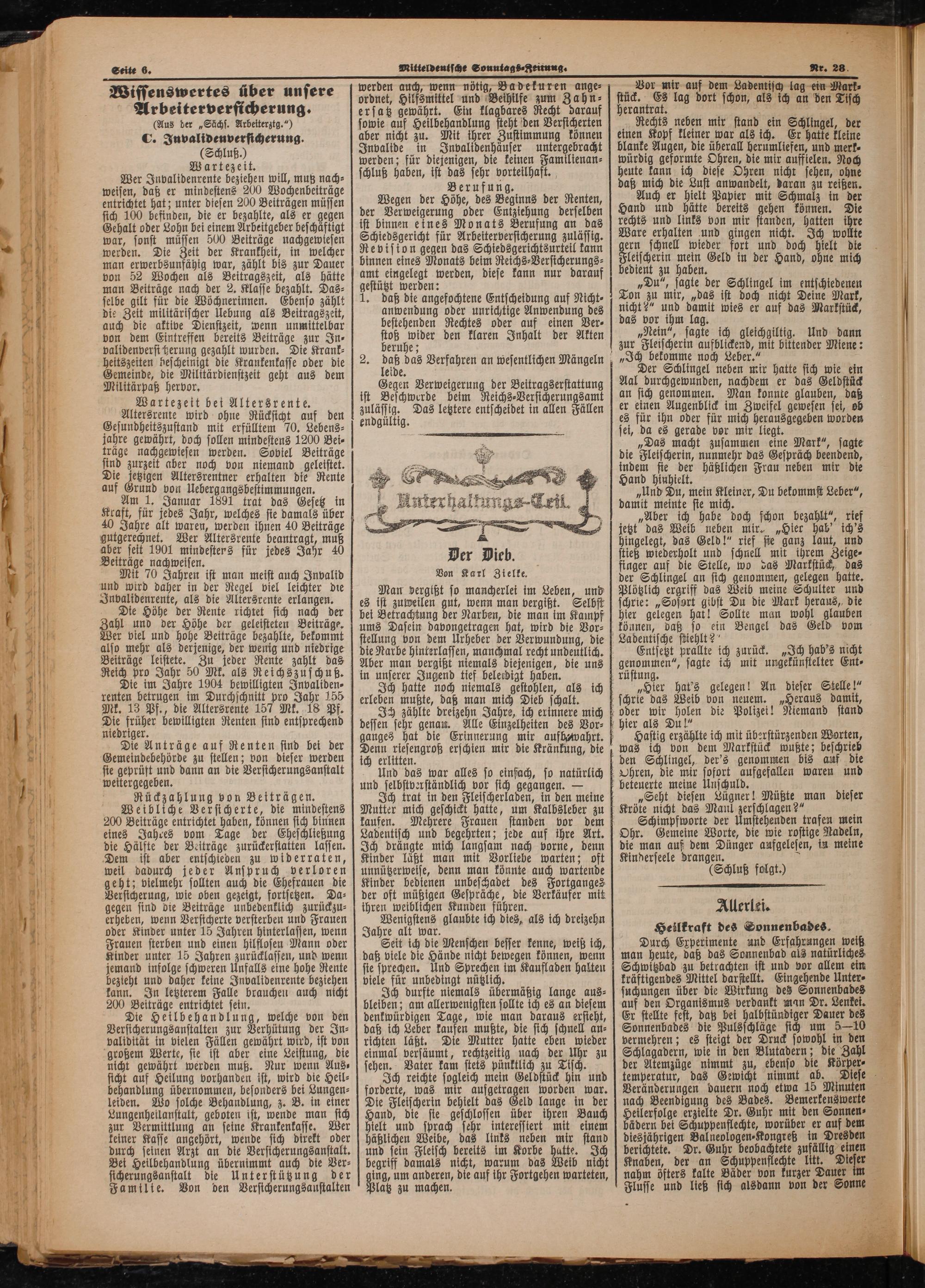 Die im Jahre 1904 bewilligten Invaliden⸗ renten betrugen im Durchschnitt pro Jahr 155 Mk. 13 Pf., die Altersrente 157 Mk. 18 Pf. Die früher bewilligten Renten sind entsprechend niedriger.