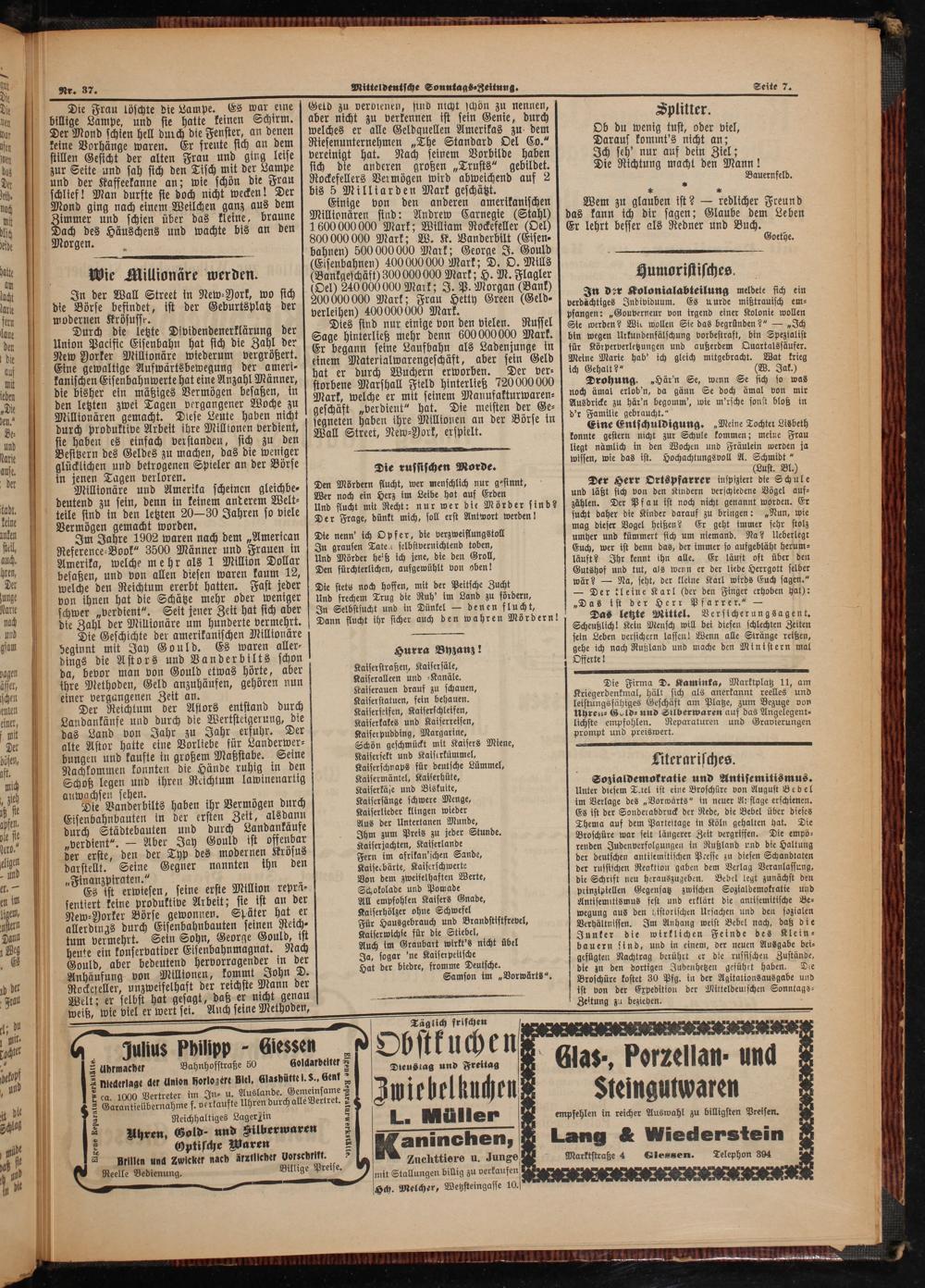 Geld zu verdienen, sind nicht schön zu nennen, aber nicht zu verkennen ist sein Genie, durch welches er alle Geldquellen Amerikas zu dem Riesenunternehmen„The Standard Oel Co.“ vereinigt hat. Nach seinem Vorbilde haben sich die anderen großen„Trusts“ gebildet. Rockefellers Vermögen wird abweichend auf 2 bis 5 Milliarden Mark geschätzt.