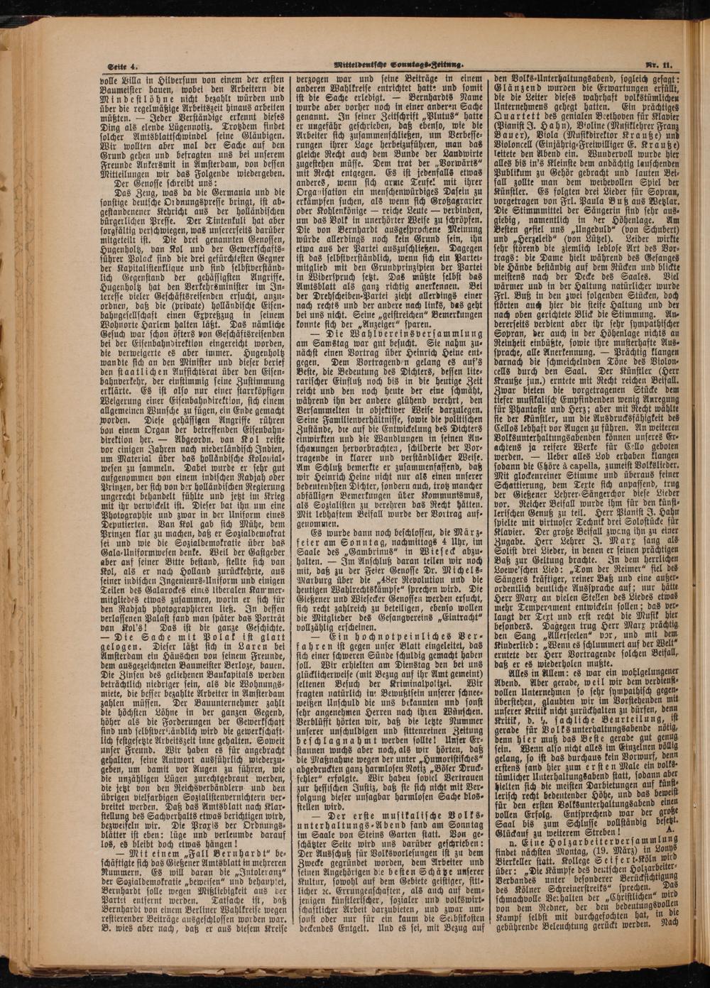 — Der erste musikalische Volks⸗ unterhaltungs⸗-Abend fand am Sonntag im Saale von Steins Garten statt. Von ge⸗ schätzter Seite wird uns darüber geschrieb en: Der Ausschuß für Volksvorlesungen ist zu dem Zwecke gegründet worden, dem Arbeiter und seinen Angehörigen die besten Schätze unserer Kultur, sowohl auf dem Gebiete geistiger, sitt⸗ licher ꝛc. Errungeanschaften, als auch auf dem⸗ jenigen künstlerischer, sozialer und volkswirt⸗ schaftlicher Arbeit darzubieten, und zwar um⸗ sonst oder nur für ein kaum die Selbstkosten deckendes Entgelt. Und es set, mit Bezug auf