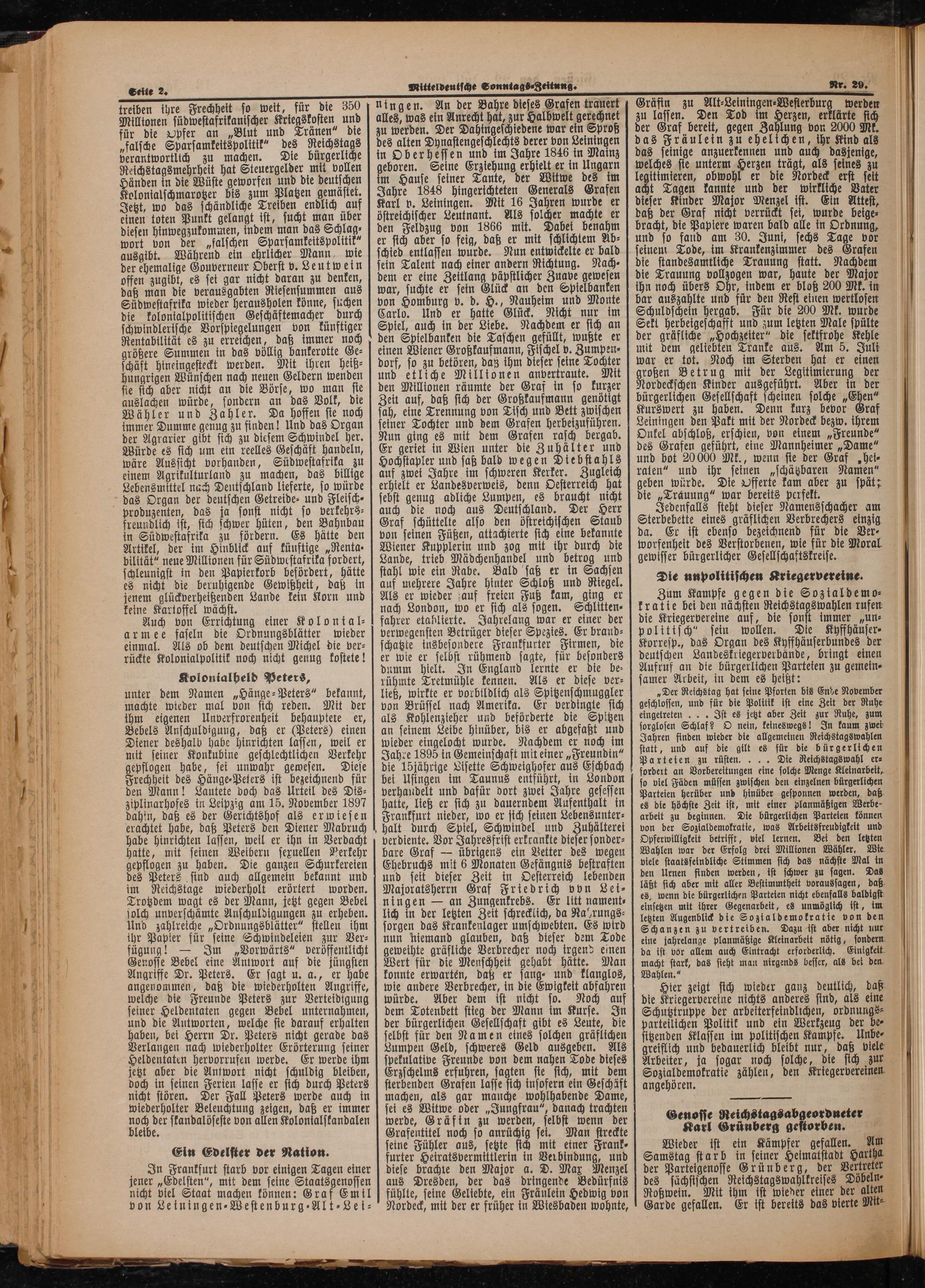 unter dem Namen„Hänge-Peters“ bekannt, machte wieder mal von sich reden. Mit der ihm eigenen Unverfrorenheit behauptete er, Bebels Anschuldigung, daß er(Peters) einen Diener deshalb habe hinrichten lassen, weil er mit seiner Konkubine geschlechtlichen Verkehr gepflogen habe, sei unwahr gewesen. Diese Frechheit des Hänge⸗Peters ist bezeichnend für den Mann! Lautete doch das Urteil des Dis⸗ ziplinarhofes in Leipzig am 15. November 1897 dahin, daß es der Gerichtshof als erwiesen erachtet habe, daß Peters den Diener Mabruch habe hinrichten lassen, weil er ihn in Verdacht hatte, mit seinen Weibern sexuellen Nerkehr gepflogen zu haben. Die ganzen Schurkereien des Peters sind auch allgemein bekannt und im Reichstage wiederholt erörtert worden. Trotzdem wagt es der Mann, jetzt gegen Bebel solch unverschämte Anschuldigungen zu erheben. Und zahlreiche„Ordnungsblätter“ stellen ihm ihr Papier für seine Schwindeleien zur Ver⸗ fügung!— Im„Vorwärts“ veröffentlicht Genosse Bebel eine Antwort auf die fjüngsten Angriffe Dr. Peters. Er sagt u. a., er habe angenommen, daß die wiederholten Angriffe, welche die Freunde Peters zur Verteidigung seiner Heldentaten gegen Bebel unternahmen, und die Antworten, welche sie darauf erhalten haben, bei Herrn Dr. Peters nicht gerade das Verlangen nach wiederholter Erörterung seiner Heldentaten hervorrufen werde. Er werde ihm jetzt aber die Antwort nicht schuldig bleiben, doch in seinen Ferien lasse er sich durch Peters nicht stören. Der Fall Peters werde auch in wiederholter Beleuchtung zeigen, daß er immer 70 der skandalöseste von allen Kolonialskandalen e 5.