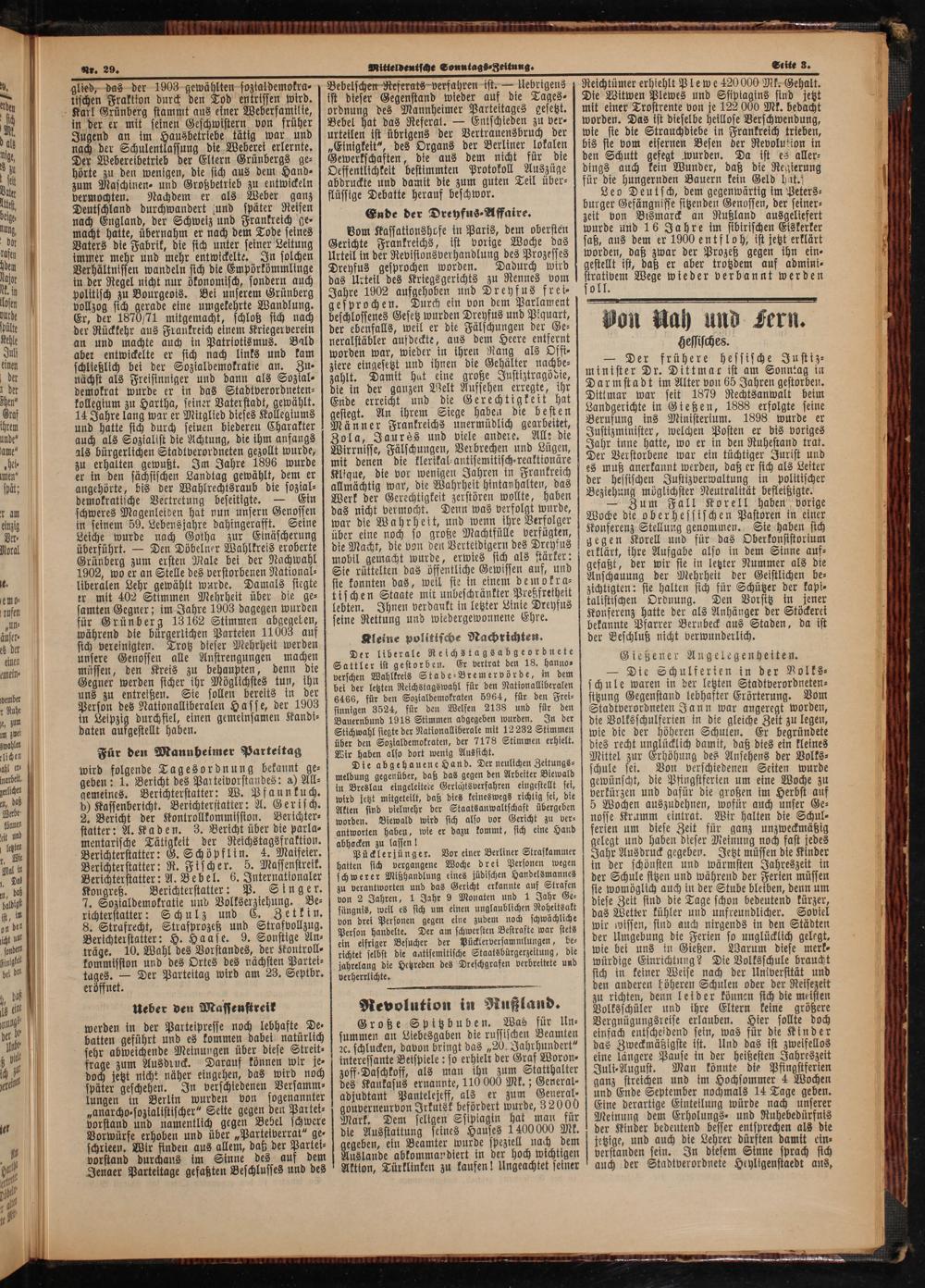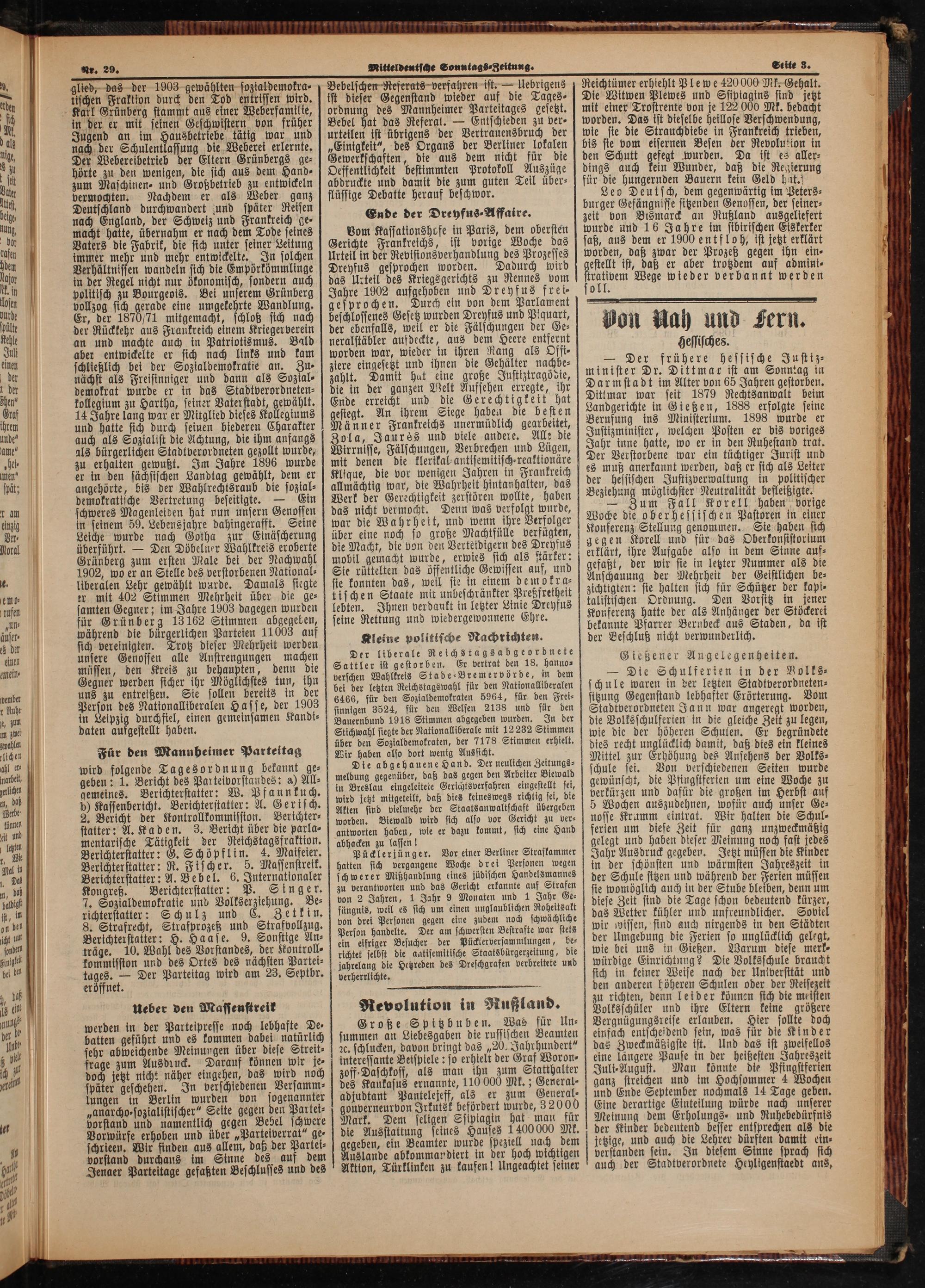 Vom Kassationshofe in Paris, dem obersten Gerichte Frankreichs, ist vorige Woche das Urteil in der Revistonsverhandlung des Prozesses Dreyfus gesprochen worden. Dadurch wird das Urteil des Kriegsgerichts zu Rennes vom Jahre 1902 aufgehoben und Dreyfus frei⸗ gesprochen. Durch ein von dem Parlament beschlossenes Gesetz wurden Dreyfus und Piquart, der ebenfalls, weil er die Fälschungen der Ge⸗ neralstäbler aufdeckte, aus dem Heere entfernt worden war, wieder in ihren Rang als Offi⸗ ziere eingesetzt und ihnen die Gehälter nachbe⸗ zahlt. Damit hat eine große Justiztragödie, die in der ganzen Welt Aufsehen erregte, ihr Ende erreicht und die Gerechtigkeit hat gestegt. An ihrem Siege haben die besten Männer Frankreichs unermüdlich gearbeitet, Zola, Jaures und viele andere. Alle die Wirrnisse, Fälschungen, Verbrechen und Lügen, mit denen die klerikal⸗antisemitisch⸗reaktionäre Klique, die vor wenigen Jahren in Frankreich allmächtig war, die Wahrheit hintanhalten, das Werk der Gerechtigkeit zerstören wollte, haben das nicht vermocht. Denn was verfolgt wurde, war die Wahrheit, und wenn ihre Verfolger über eine noch so große Machtfülle verfügten, die Macht, die von den Verteidigern des Dreyfus mobil gemacht wurde, erwies sich als stärker: Sie rüttelten das öffentliche Gewissen auf, und ste konnten das, weil sie in einem demokra⸗ tischen Staate mit unbeschränkter Preßfretheit lebten. Ihnen verdankt in letzter Linie Dreyfus seine Rettung und wiedergewonnene Ehre.